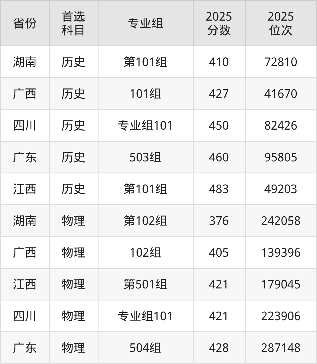 历史类最低分对应地区为湖南(第101组),录取位次为72810;最高分对应地区为江西(第101组),录取位次为49203,超专科线193分。