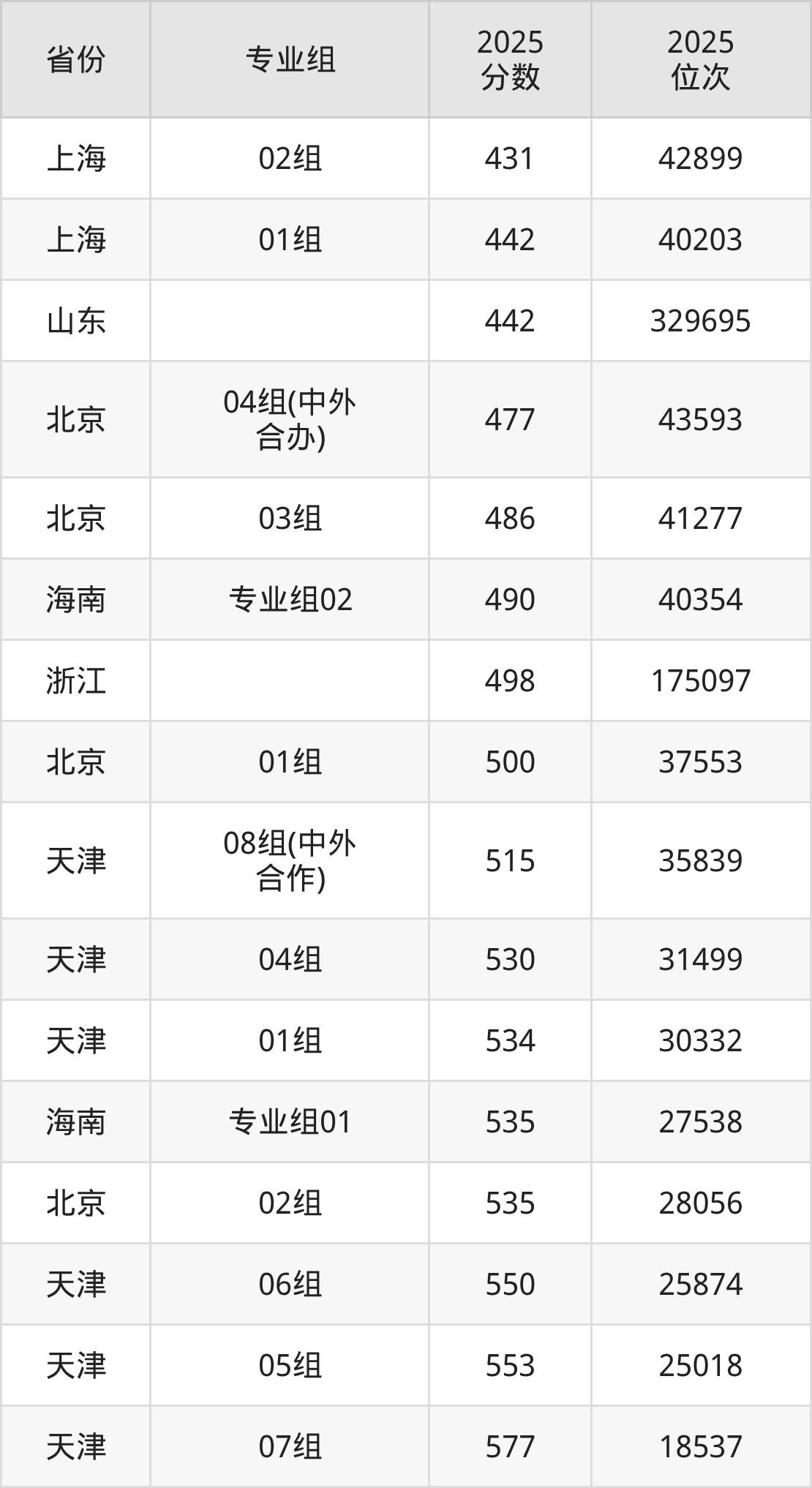 最低分对应地区为上海(02组),录取位次为42899,超本科线29分;最高分对应地区为海南(专业组04),录取位次为6465,超本科线158分。