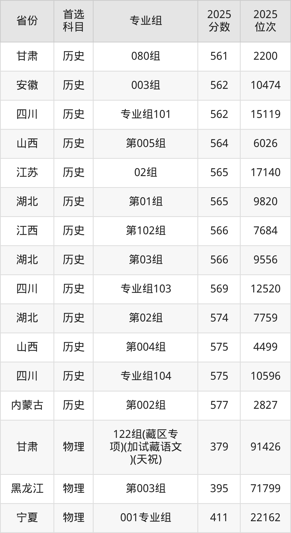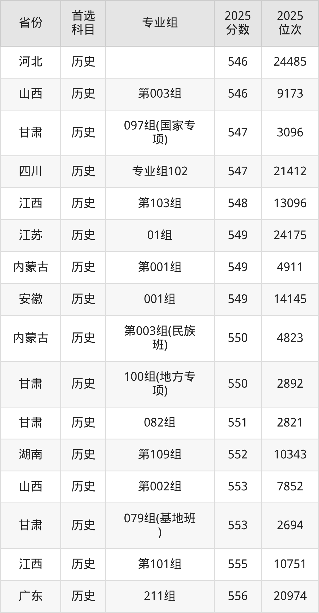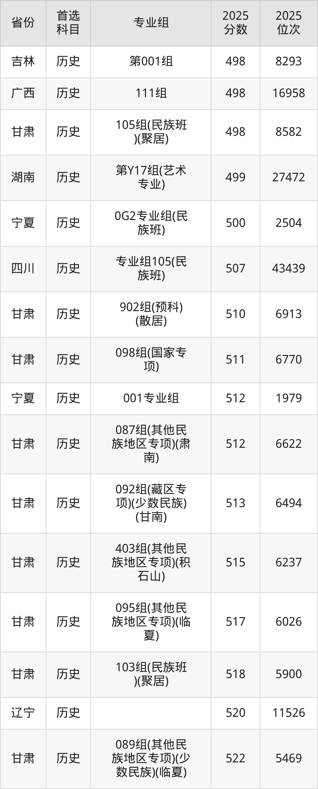 历史类:079组(基地班)553分、2694名,080组561分、2200名,081组524分、5232名,082组551分、2821名,083组(藏区专项)(甘南)485分、10519名,084组(藏区专项)(天祝)497分、8726名,085组(藏区专项)(加试藏语文)(天祝)364分、36212名,086组(其他民族地区专项)(阿克塞)490分、9734名,087组(其他民族地区专项)(肃南)512分、6622名,088组(其他民族地区专项)(张家川)495分、9030名,089组(其他民族地区专项)(少数民族)(临夏)522分、5469名,090组(藏区专项)(天祝)529分、4702名,091组(藏区专项)(加试藏语文)(天祝)437分、19896名,092组(藏区专项)(少数民族)(甘南)513分、6494名,093组(藏区专项)(加试藏语文)(甘南)466分、13969名,094组(藏区专项)(少数民族)(甘南)471分、12998名,095组(其他民族地区专项)(临夏)517分、6026名,096组(藏区专项)(甘南)497分、8726名,097组(国家专项)547分、3096名,098组(国家专项)511分、6770名,099组(国家专项)536分、4038名,100组(地方专项)550分、2892名,101组(地方专项)525分、5132名,102组(地方专项)545分、3246名,103组(民族班)(聚居)518分、5900名,104组(民族班)(聚居)487分、10200名,105组(民族班)(聚居)498分、8582名,106组(民族班)(散居)484分、10678名,107组(民族班)(散居)485分、10519名,403组(其他民族地区专项)(积石山)515分、6237名,901组(预科)(聚居)496分、8866名,902组(预科)(散居)510分、6913名;