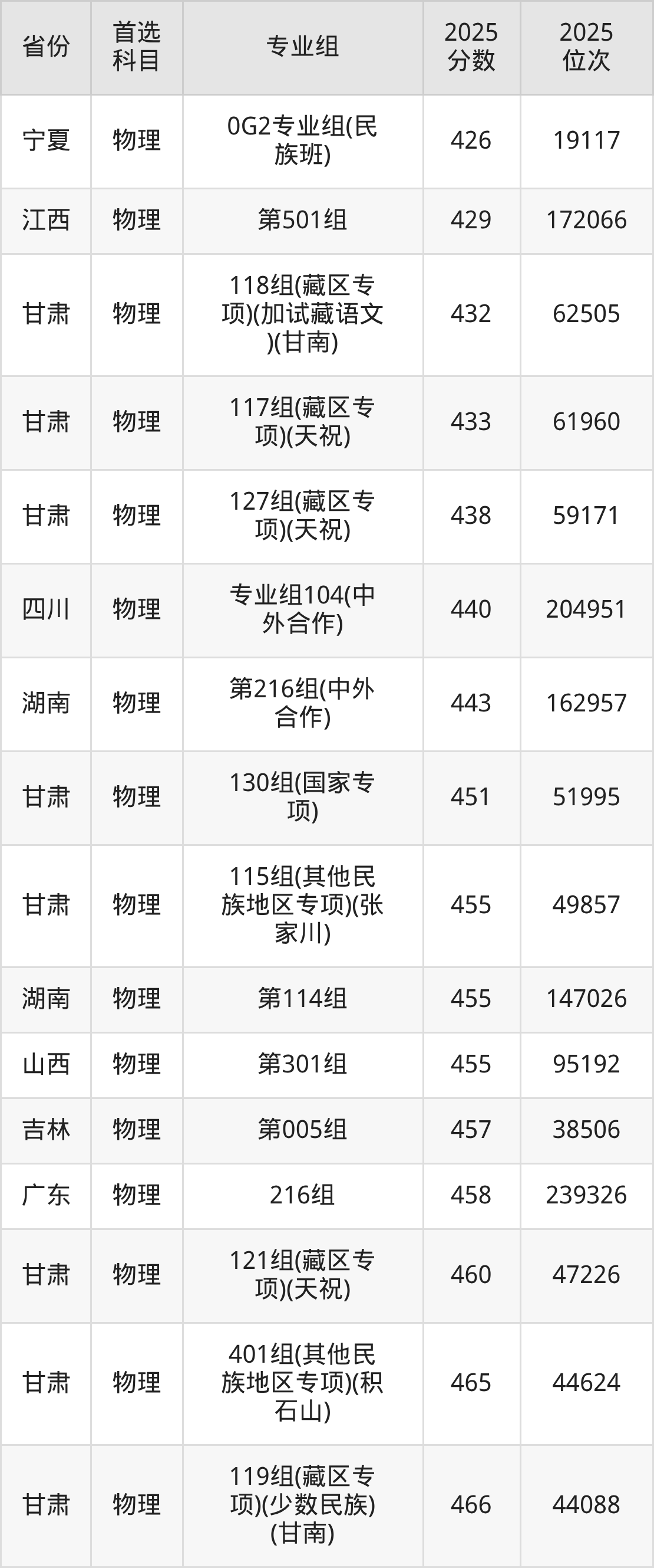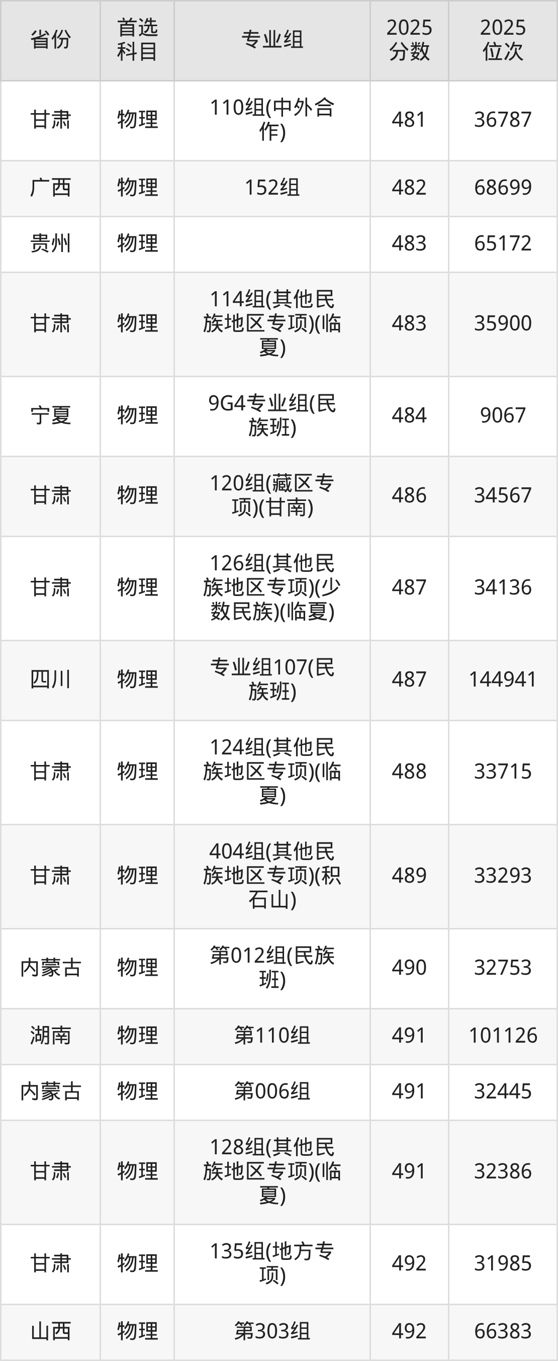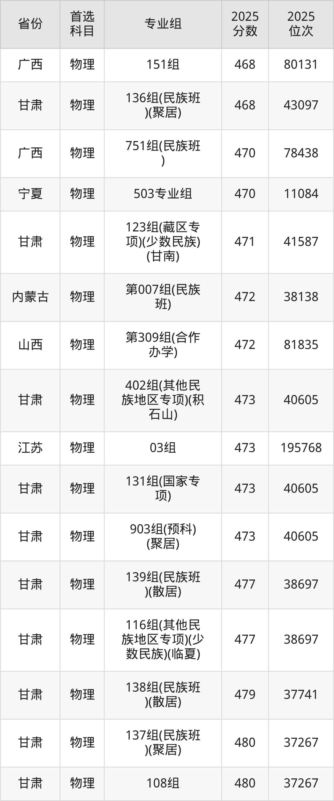 物理类:008组(定向)546分、17293名,009组(定向)547分、16984名,010组(定向)491分、36963名,012组(定向)532分、21571名,013组(定向)536分、20298名,057组525分、23897名,059组(中外合作)520分、25644名,060组565分、12159名,061组543分、18166名,062组548分、16688名,064组(藏区专项)(加试藏语文)(天祝)285分、111131名,065组(藏区专项)(加试藏语文)(甘南)455分、52999名,066组(其他民族地区专项)(张家川)469分、46511名,067组(其他民族地区专项)(积石山县)462分、49704名,068组(其他民族地区专项)(少数民族)(临夏)490分、37379名,070组(藏区专项)(天祝)433分、63669名,073组(藏区专项)(加试藏语文)(甘南)463分、49208名,074组(藏区专项)(少数民族)(甘南)488分、38187名,075组(藏区专项)(天祝)443分、58791名,076组(藏区专项)(加试藏语文)(天祝)449分、55867名,077组(其他民族地区专项)(张家川)532分、21571名,078组(藏区专项)(甘南)506分、30967名,079组(藏区专项)(少数民族)(甘南)477分、42992名,080组(其他民族地区专项)(临夏)494分、35721名,082组(其他民族地区专项)(少数民族)(临夏)497分、34498名,083组(藏区专项)(天祝)461分、50186名,084组(藏区专项)(天祝)441分、59775名,085组(其他民族地区专项)(积石山县)453分、53934名,086组(其他民族地区专项)(少数民族)(临夏)497分、34498名,087组(国家专项)514分、27955名,090组(国家专项)531分、21870名,091组(国家专项)531分、21870名,093组(地方专项)500分、33327名,095组(地方专项)517分、26819名,096组(地方专项)515分、27551名,097组(民族班)(聚居)492分、36523名,099组(民族班)(聚居)500分、33327名,100组(民族班)(散居)497分、34498名,101组(民族班)(散居)511分、29072名,903组(预科)(聚居)489分、37763名,904组(预科)(散居)505分、31353名;