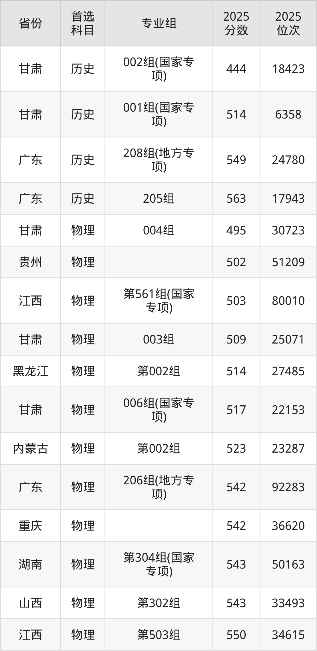 历史类最低分对应地区为甘肃(002组(国家专项)),录取位次为18423,超本科线32分;最高分对应地区为广东(205组),录取位次为17943,超本科线99分。
