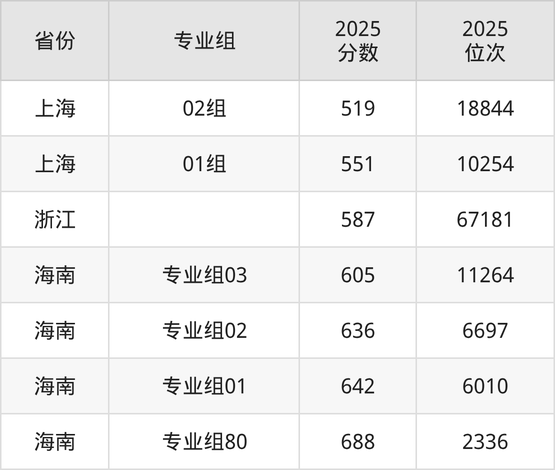 最低分对应地区为上海(02组),录取位次为18844,超本科线117分;最高分对应地区为海南(专业组80),录取位次为2336,超本科线208分。