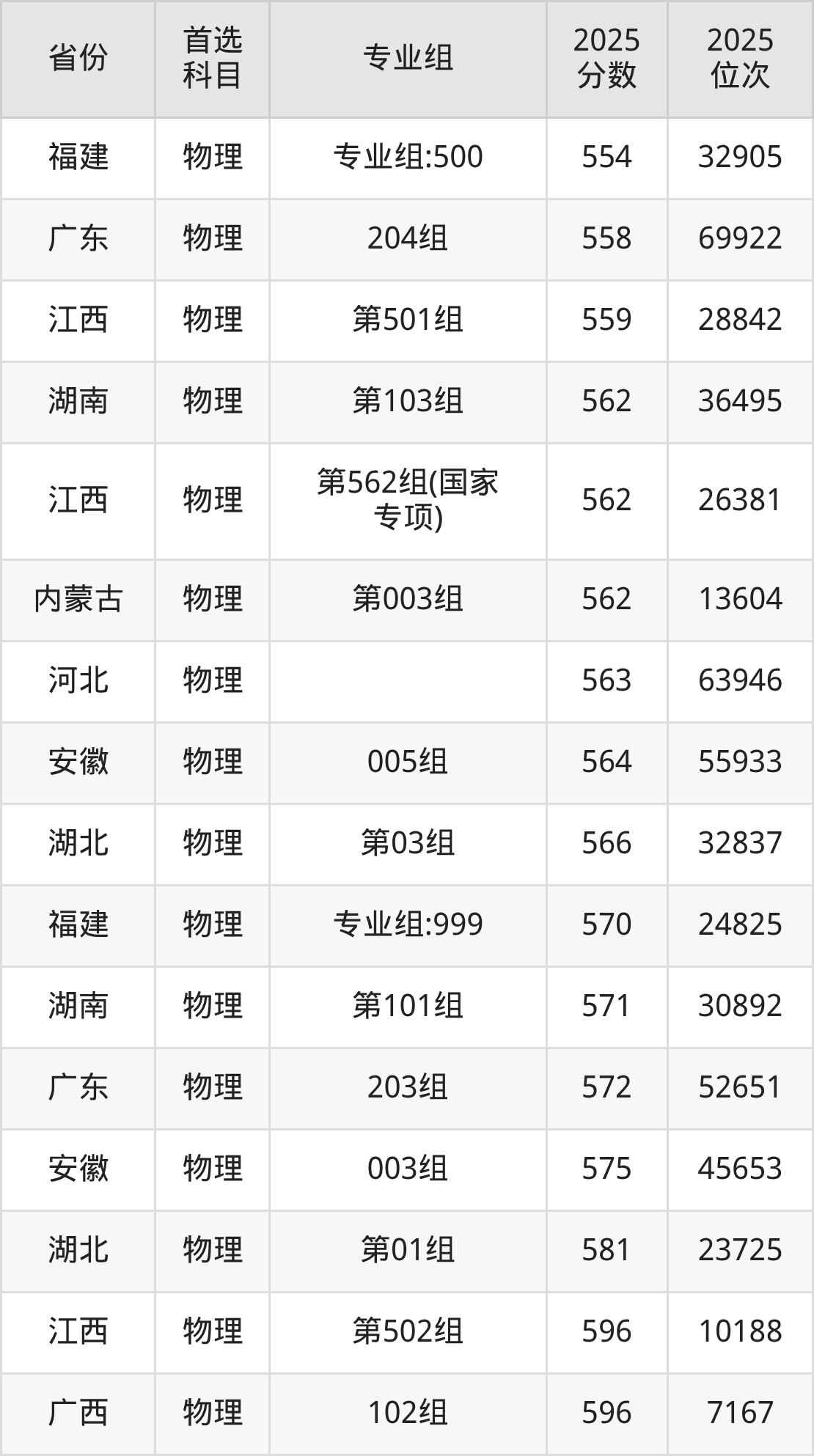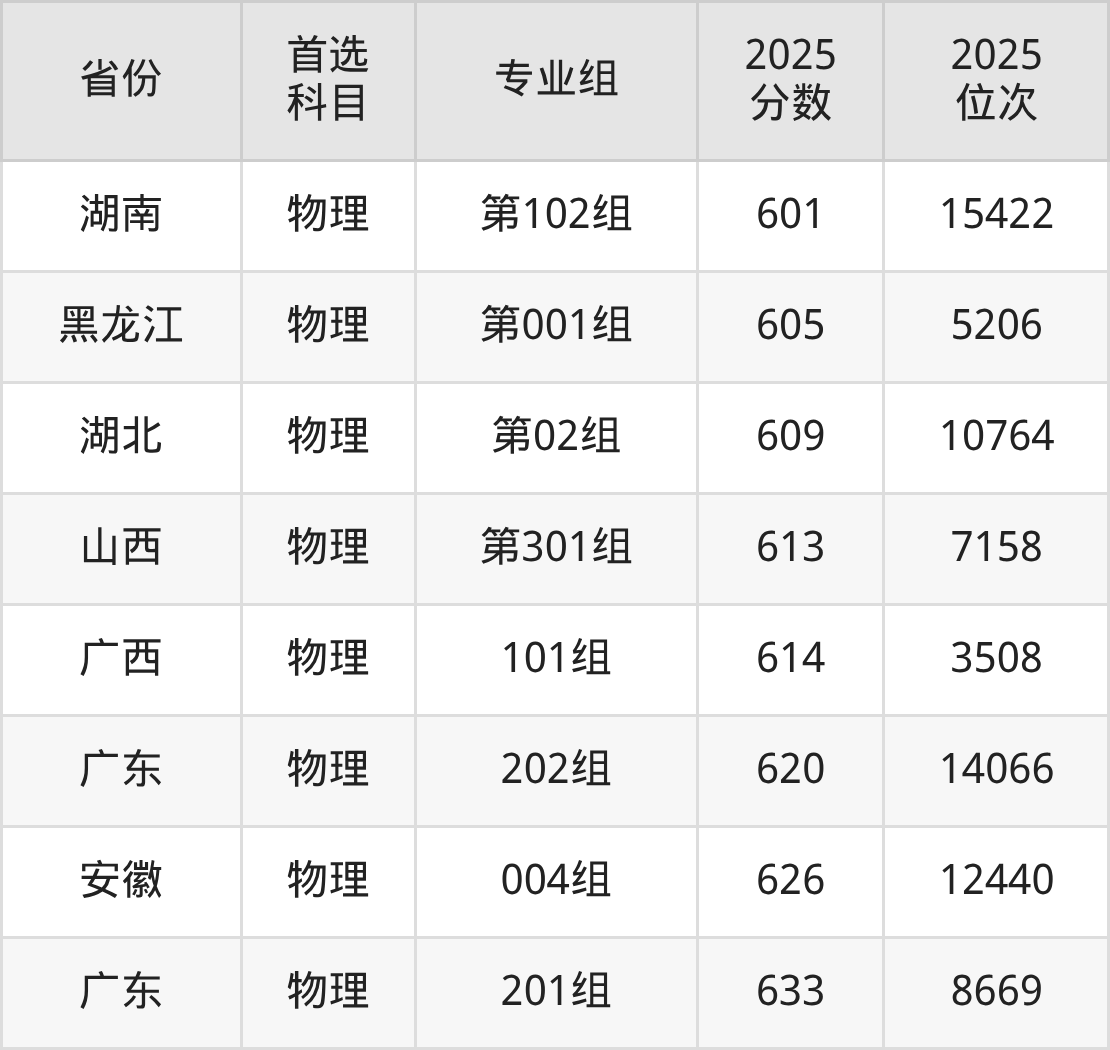 物理类最低分对应地区为甘肃(004组),录取位次为30723,超本科线121分;最高分对应地区为广东(201组),录取位次为8669,超本科线197分。