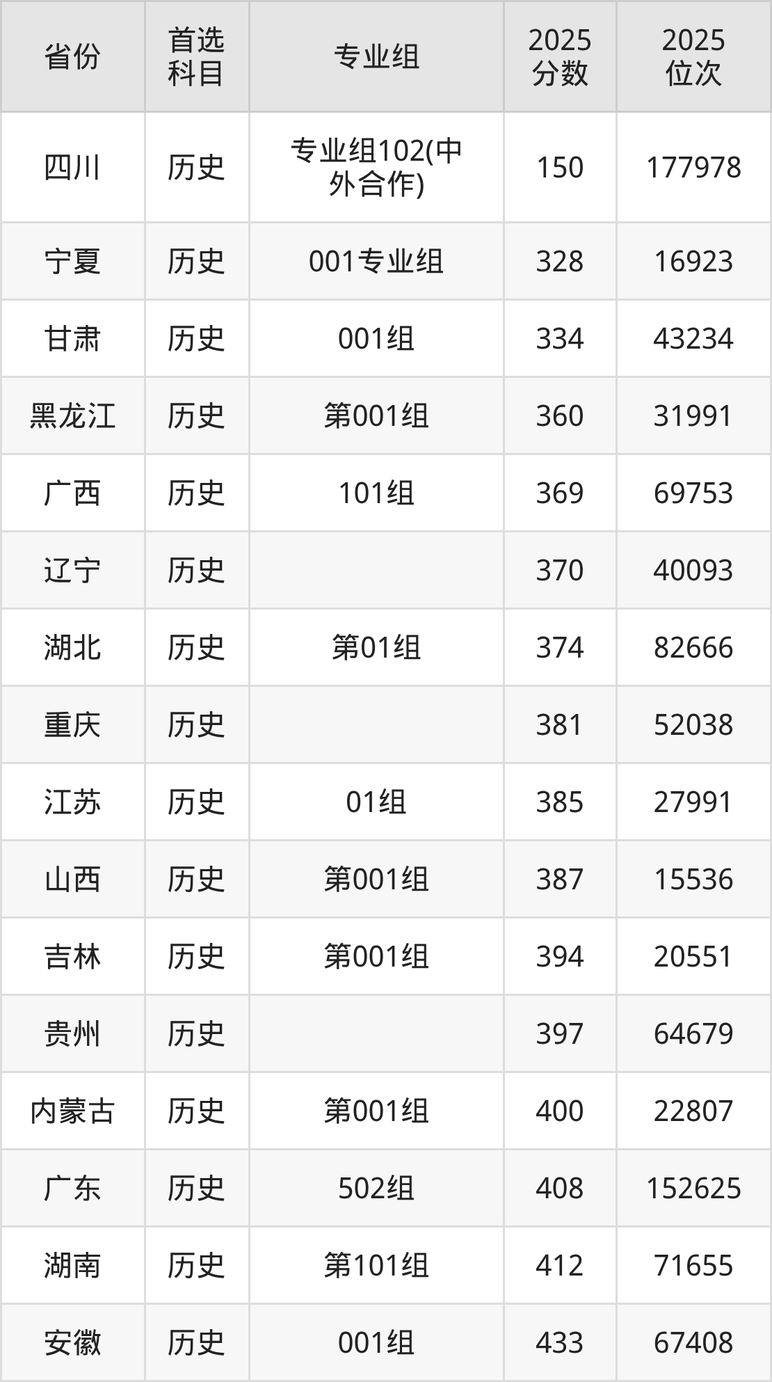 历史类:专业组101461分、74786名,专业组102(中外合作)150分、177978名;
