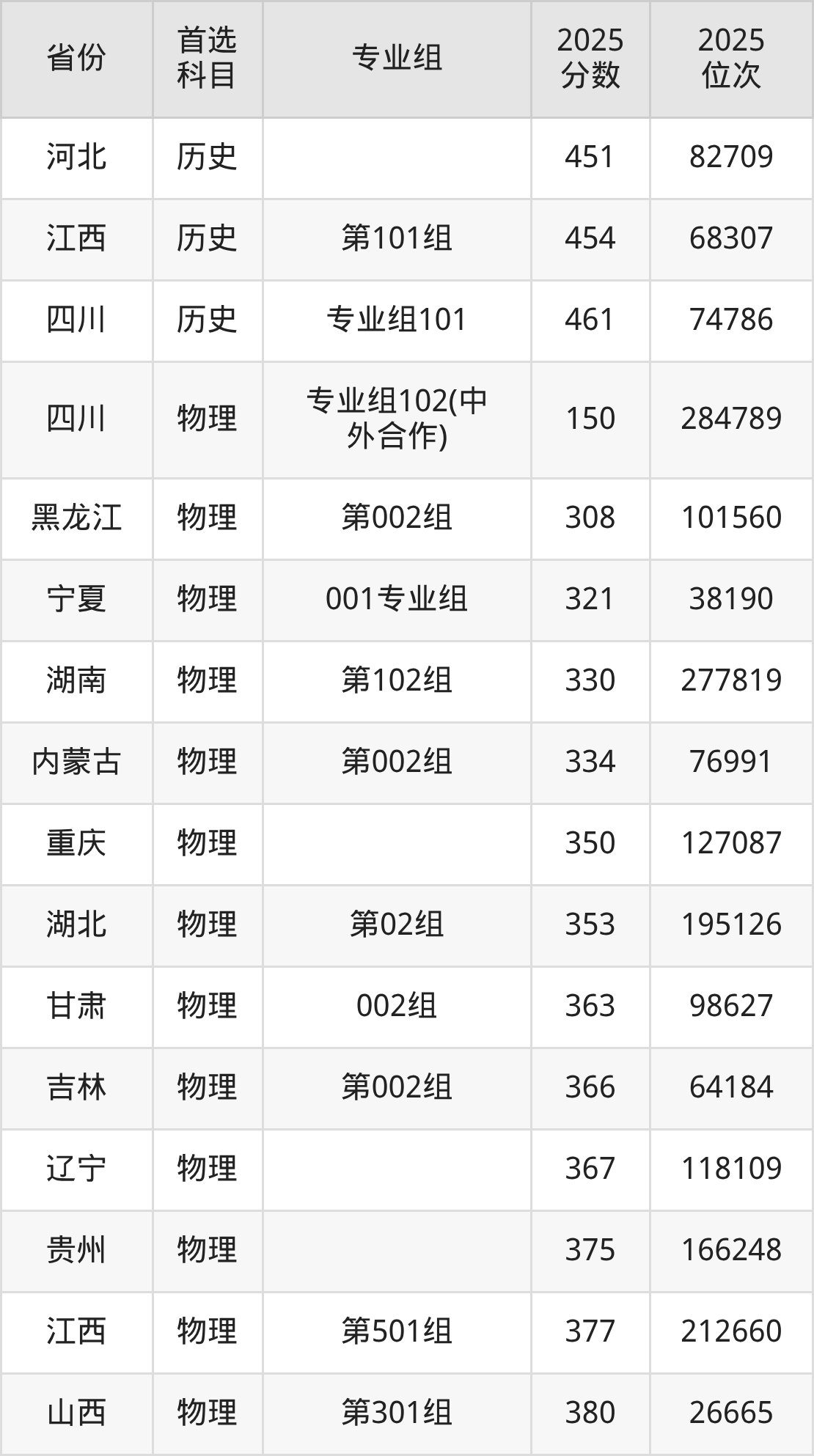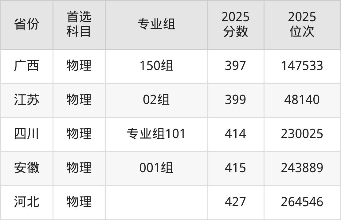 物理类最低分对应地区为四川(专业组102(中外合作)),录取位次为284789;最高分对应地区为河北,录取位次为264546,超专科线227分。