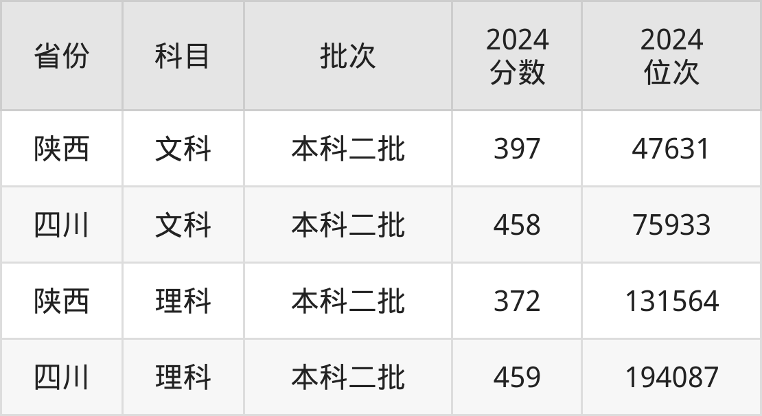 理科最低分对应地区为陕西,录取位次为131564,超二本线0分;最高分对应地区为四川,录取位次为194087,超二本线0分。