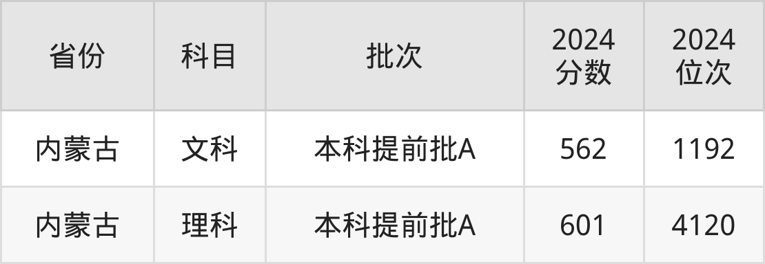 文科最低分对应地区为内蒙古,录取位次为1192,超一本线84分。