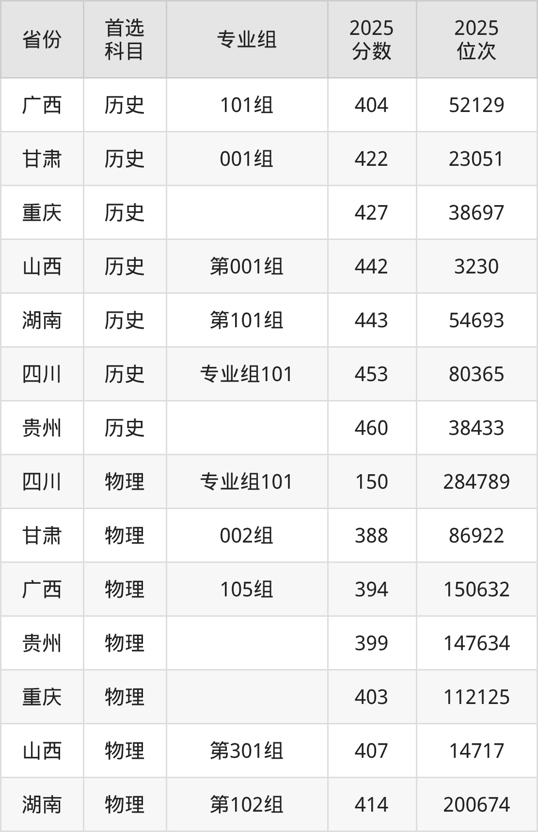 历史类最低分对应地区为广西(101组),录取位次为52129,超专科线204分;最高分对应地区为贵州,录取位次为38433。
