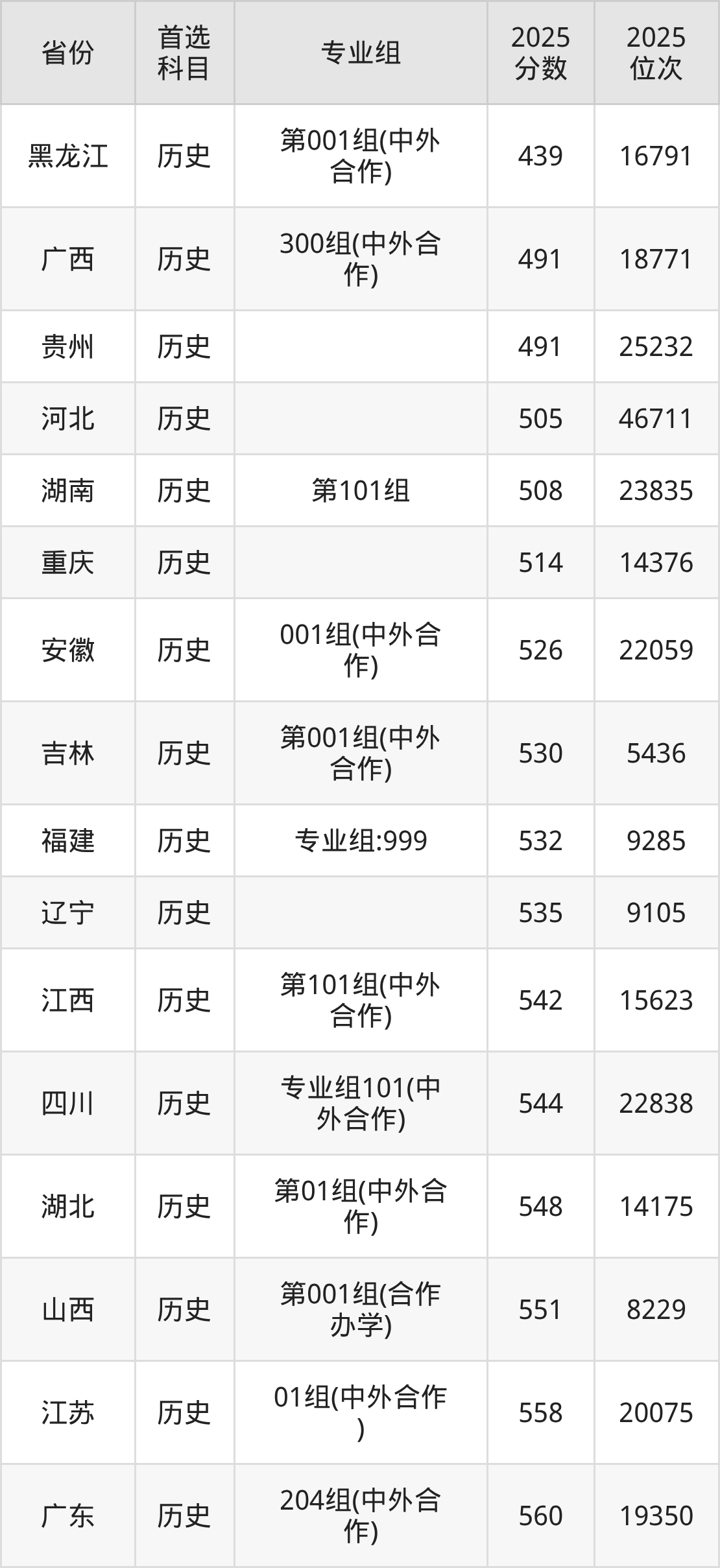 历史类最低分对应地区为黑龙江(第001组(中外合作)),录取位次为16791,超本科线34分;最高分对应地区为广东(204组(中外合作)),录取位次为19350,超本科线96分。