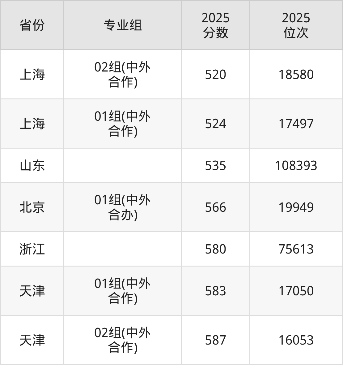 最低分对应地区为上海(02组(中外合作)),录取位次为18580,超本科线118分;最高分对应地区为天津(02组(中外合作)),录取位次为16053,超本科线111分。