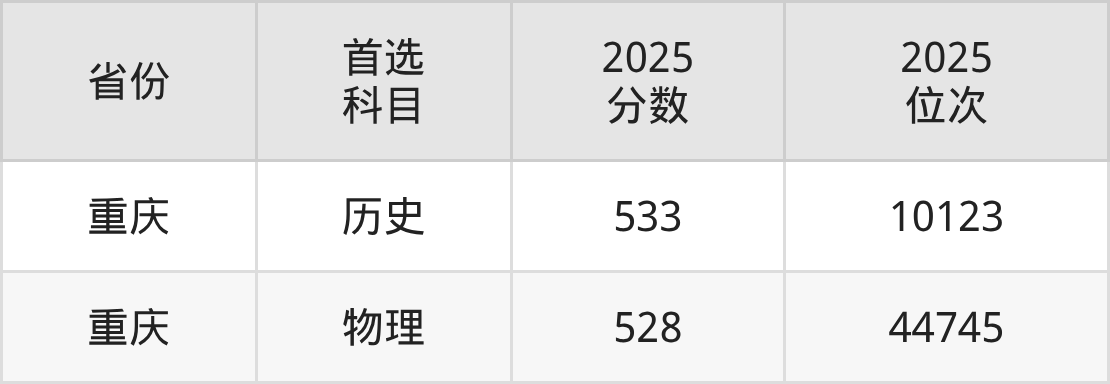 历史类最低分对应地区为重庆,录取位次为10123,超本科线95分。