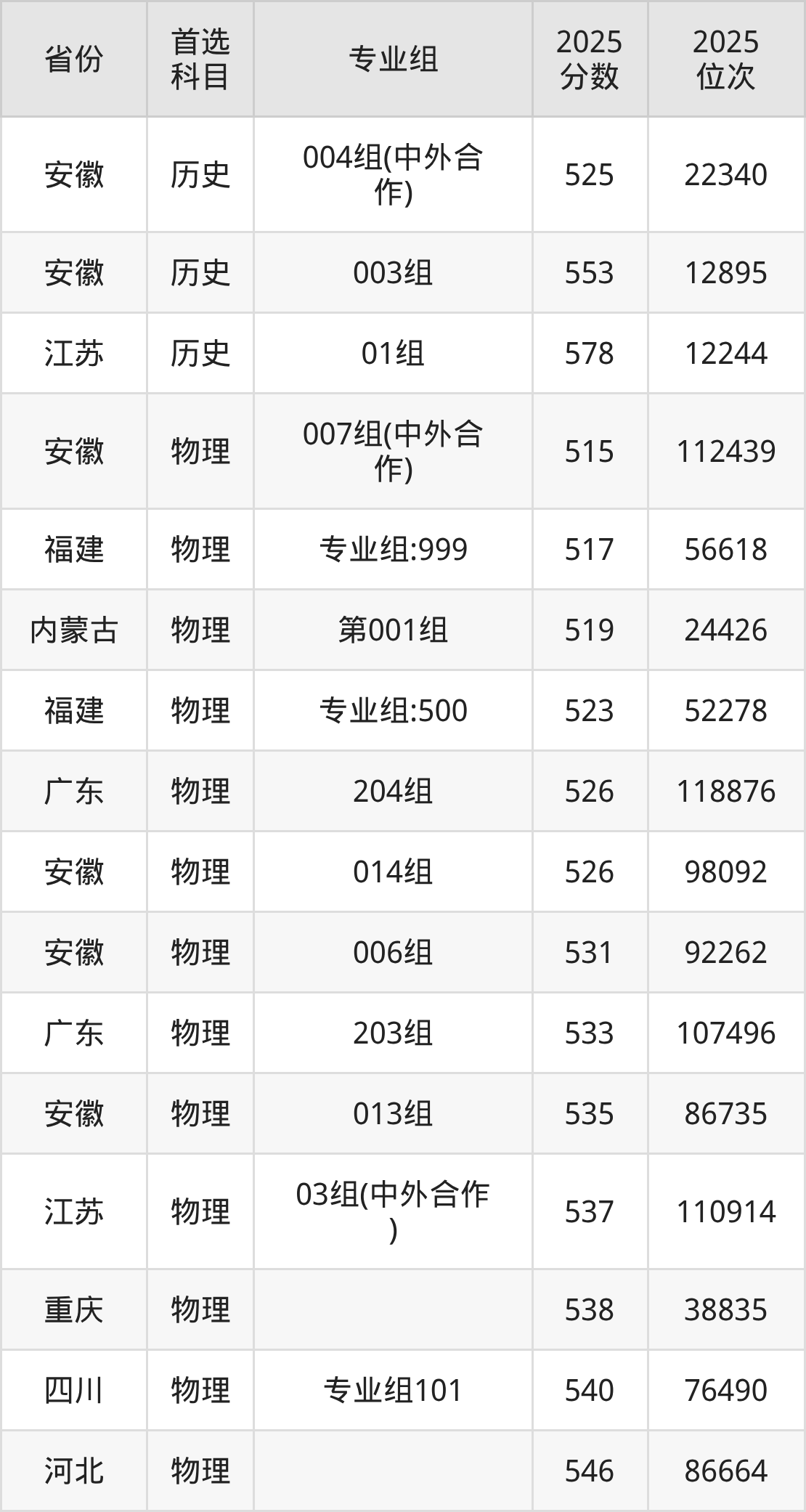 历史类最低分对应地区为安徽(004组(中外合作)),录取位次为22340,超本科线48分;最高分对应地区为江苏(01组),录取位次为12244,超本科线96分。