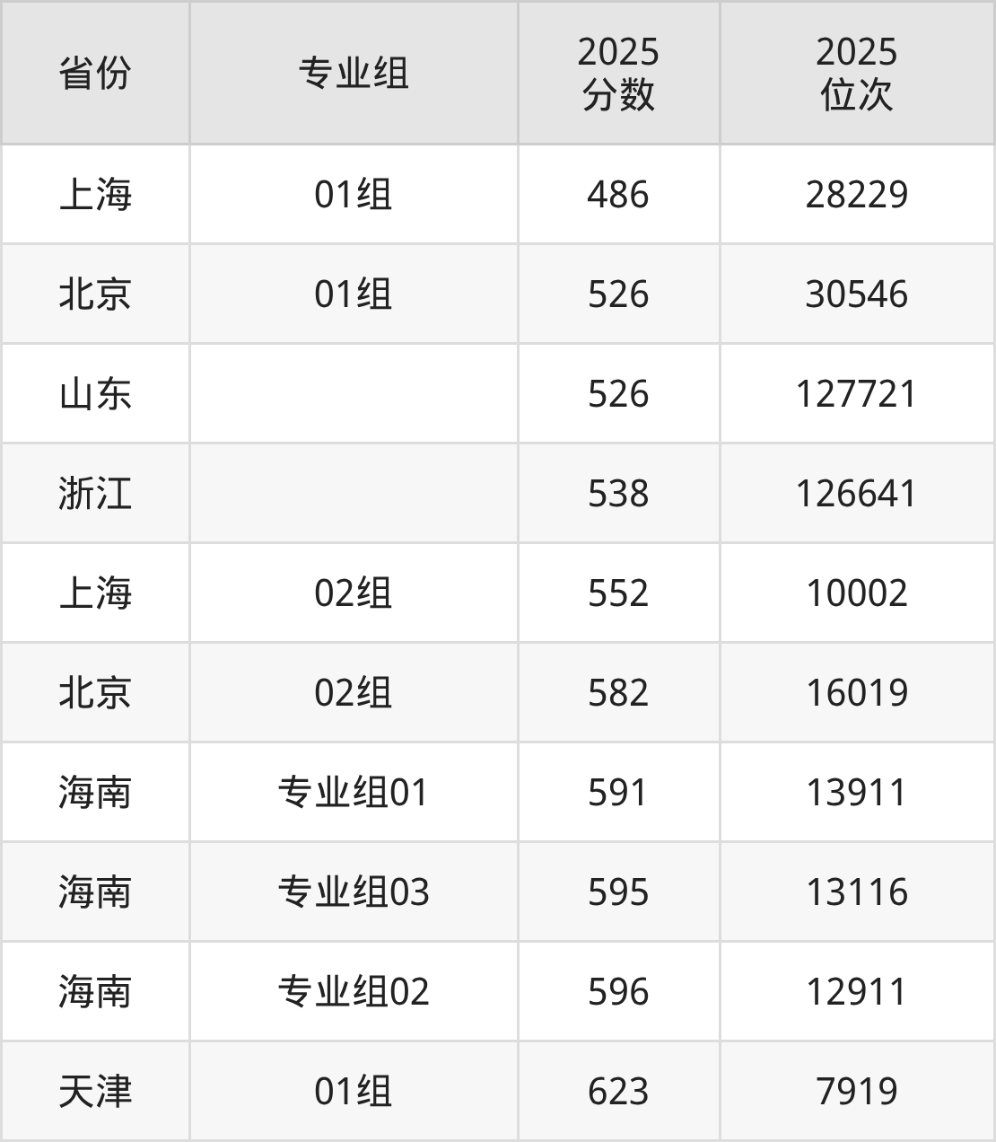 最低分对应地区为上海(01组),录取位次为28229,超本科线84分;最高分对应地区为天津(01组),录取位次为7919,超本科线147分。
