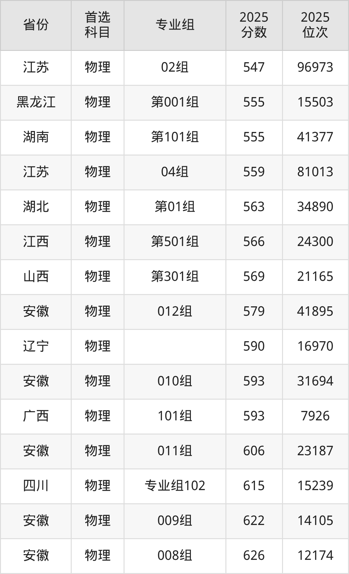 物理类最低分对应地区为安徽(007组(中外合作)),录取位次为112439,超本科线54分;最高分对应地区为安徽(008组),录取位次为12174,超本科线165分。