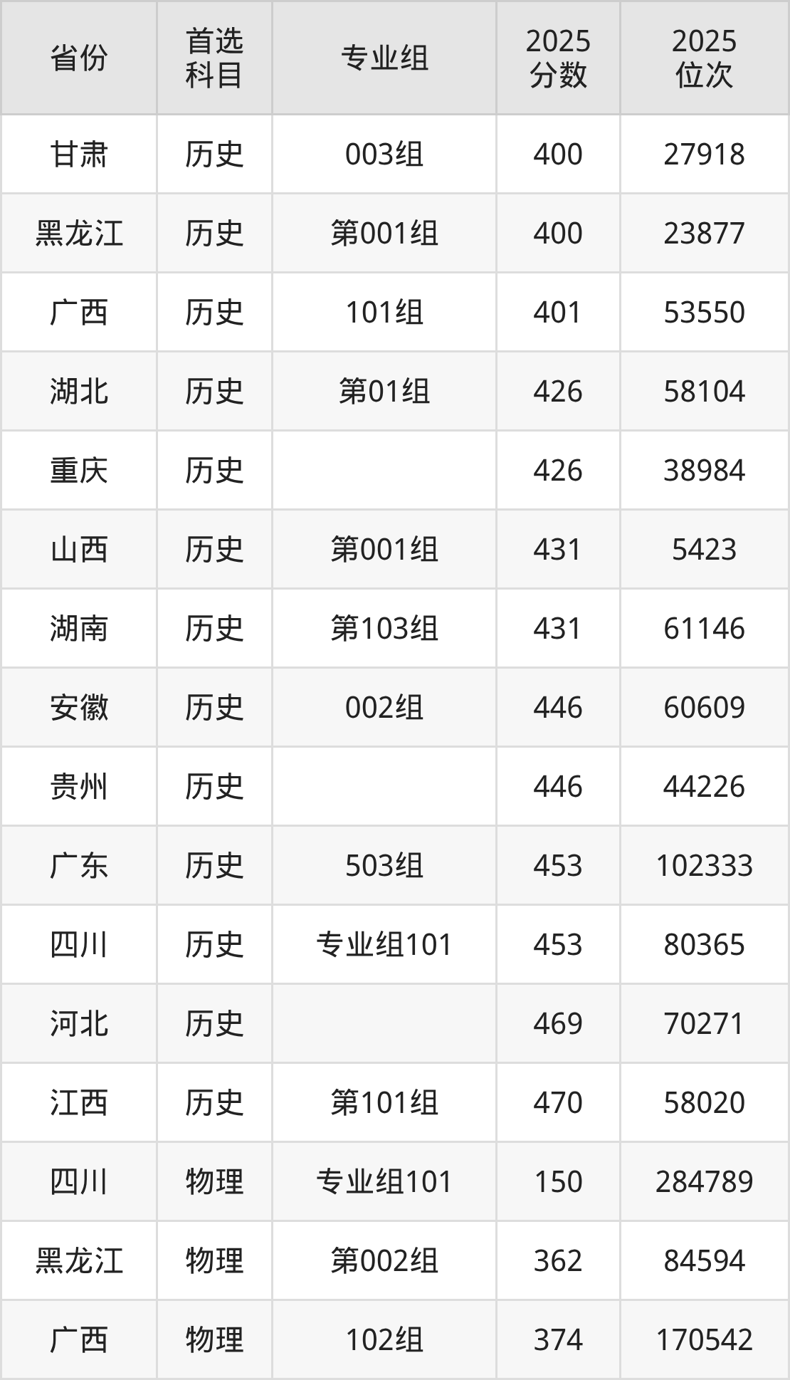 历史类最低分对应地区为甘肃(003组),录取位次为27918;最高分对应地区为江西(第101组),录取位次为58020。