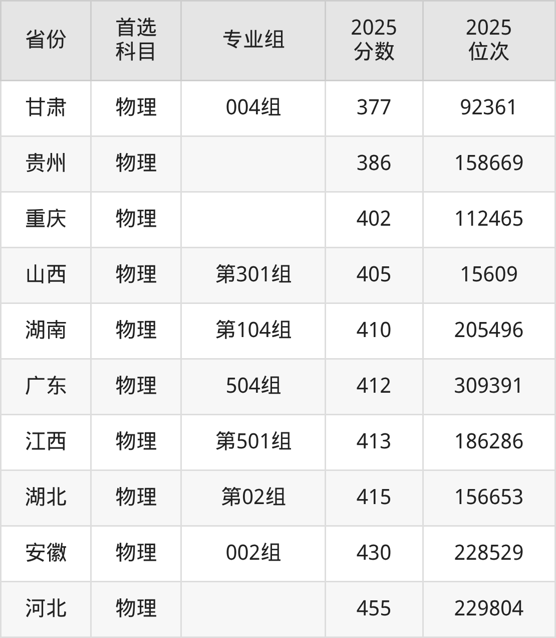 物理类最低分对应地区为四川(专业组101),录取位次为284789;最高分对应地区为河北,录取位次为229804,超专科线255分。