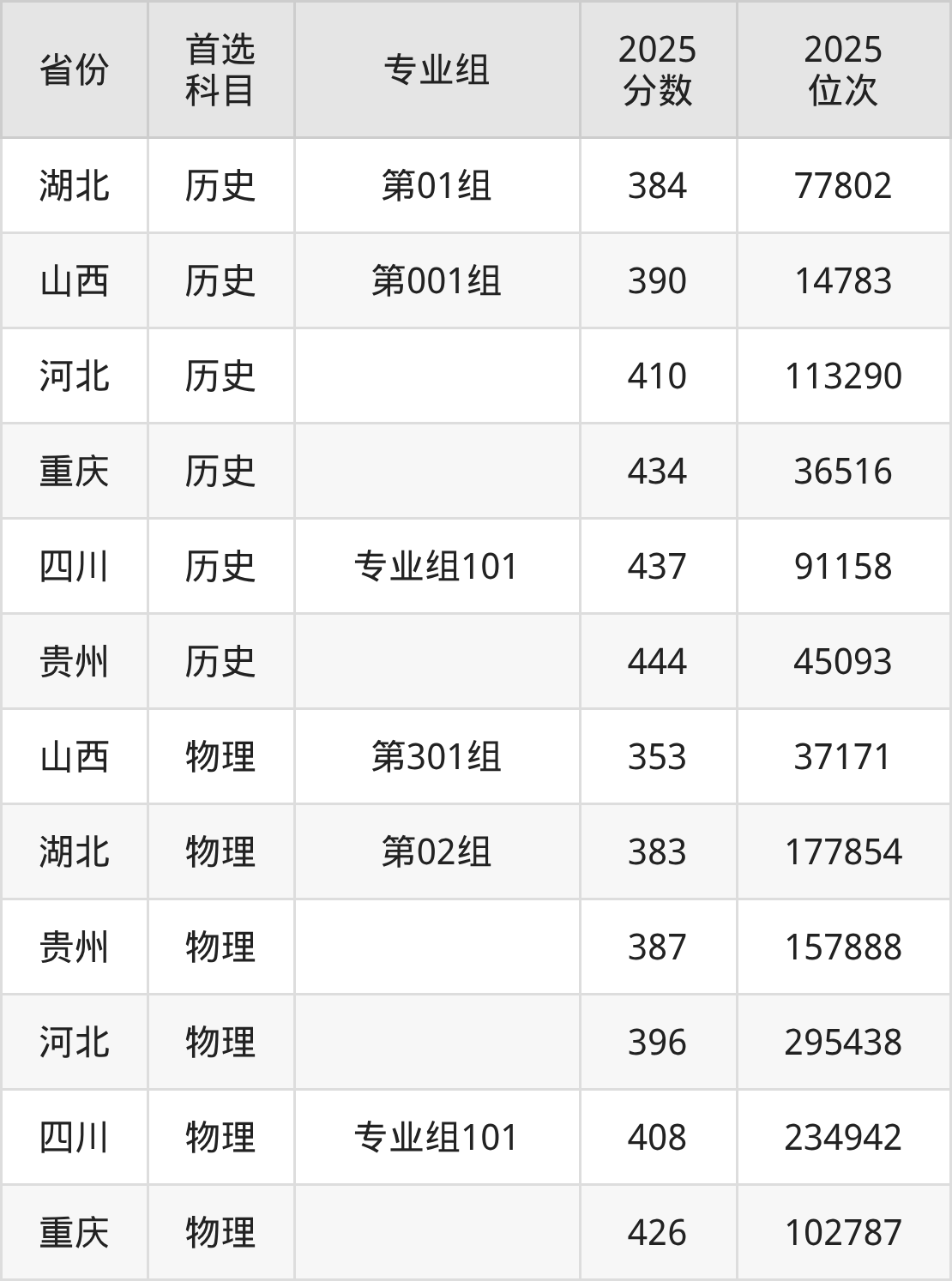 历史类最低分对应地区为湖北(第01组),录取位次为77802,超专科线184分;最高分对应地区为贵州,录取位次为45093,超专科线264分。