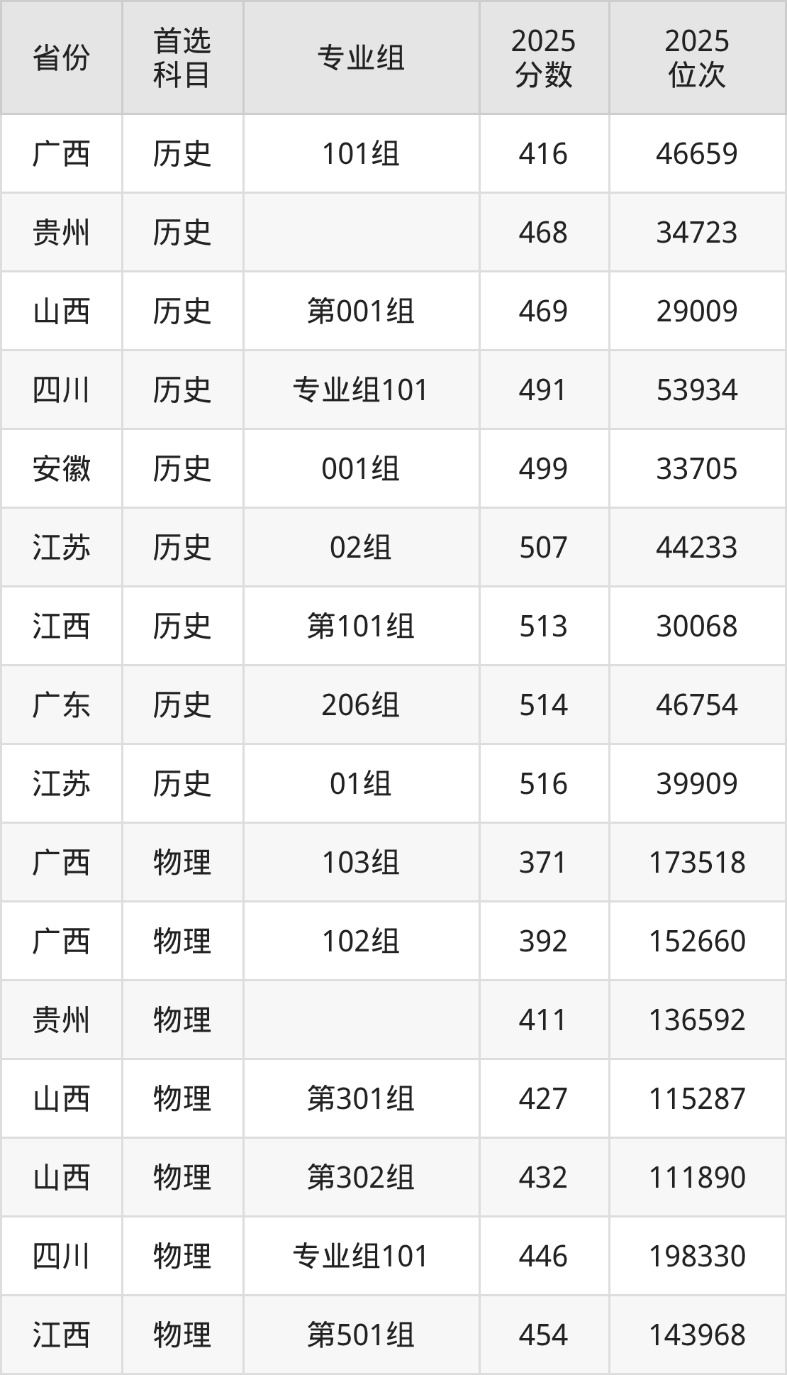 历史类最低分对应地区为广西(101组),录取位次为46659,超本科线14分;最高分对应地区为江苏(01组),录取位次为39909,超本科线34分。