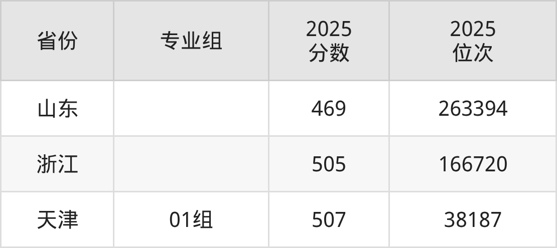 最低分对应地区为山东,录取位次为263394;最高分对应地区为天津(01组),录取位次为38187,超本科线31分。