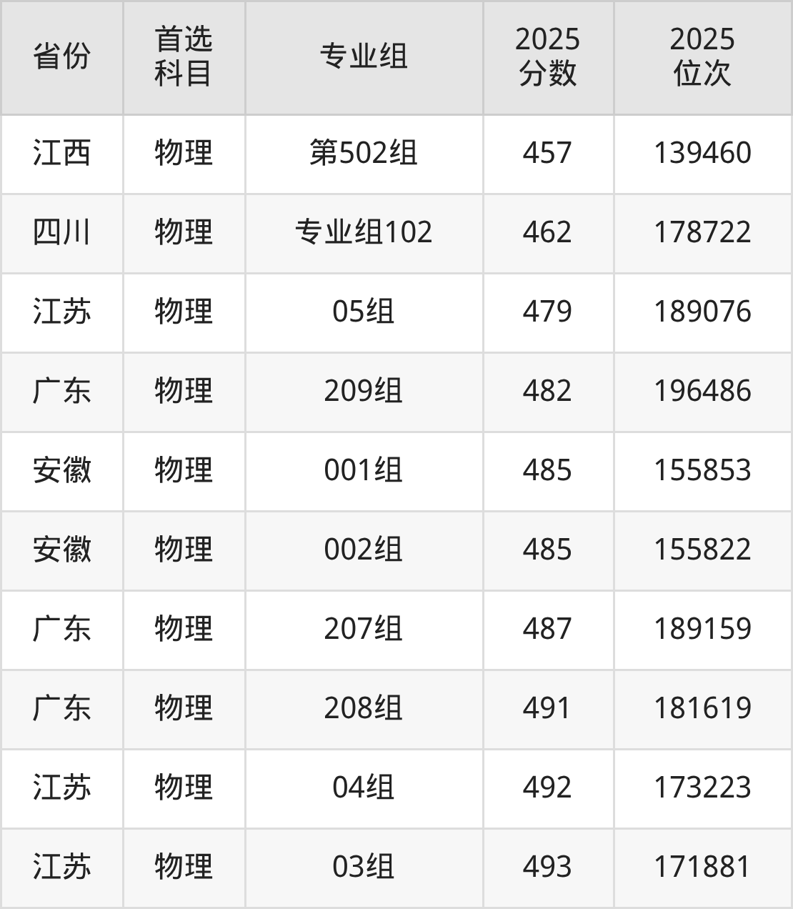 物理类:03组493分、171881名,04组492分、173223名,05组479分、189076名;