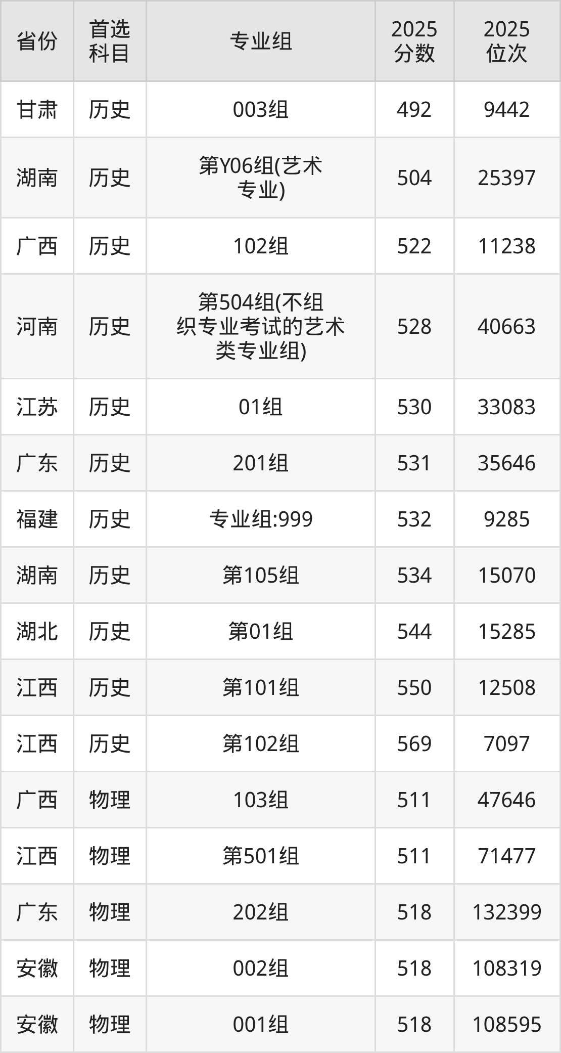 历史类最低分对应地区为甘肃(003组),录取位次为9442;最高分对应地区为江西(第102组),录取位次为7097,超本科线83分。