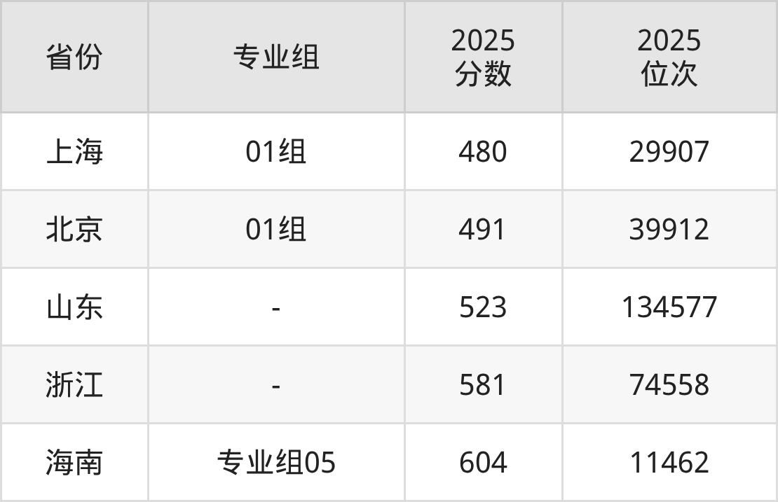 最低分对应地区为上海(01组),录取位次为29907,超本科线78分;最高分对应地区为海南(专业组05),录取位次为11462,超本科线124分。