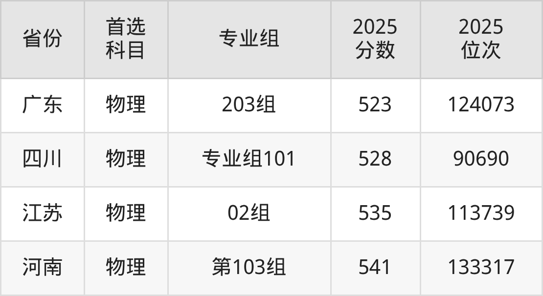 物理类最低分对应地区为广西(103组),录取位次为47646,超本科线141分;最高分对应地区为河南(第103组),录取位次为133317,超本科线114分。