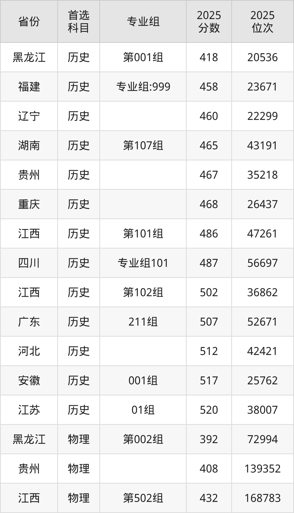 历史类最低分对应地区为黑龙江(第001组),录取位次为20536,超本科线13分;最高分对应地区为江苏(01组),录取位次为38007,超本科线38分。