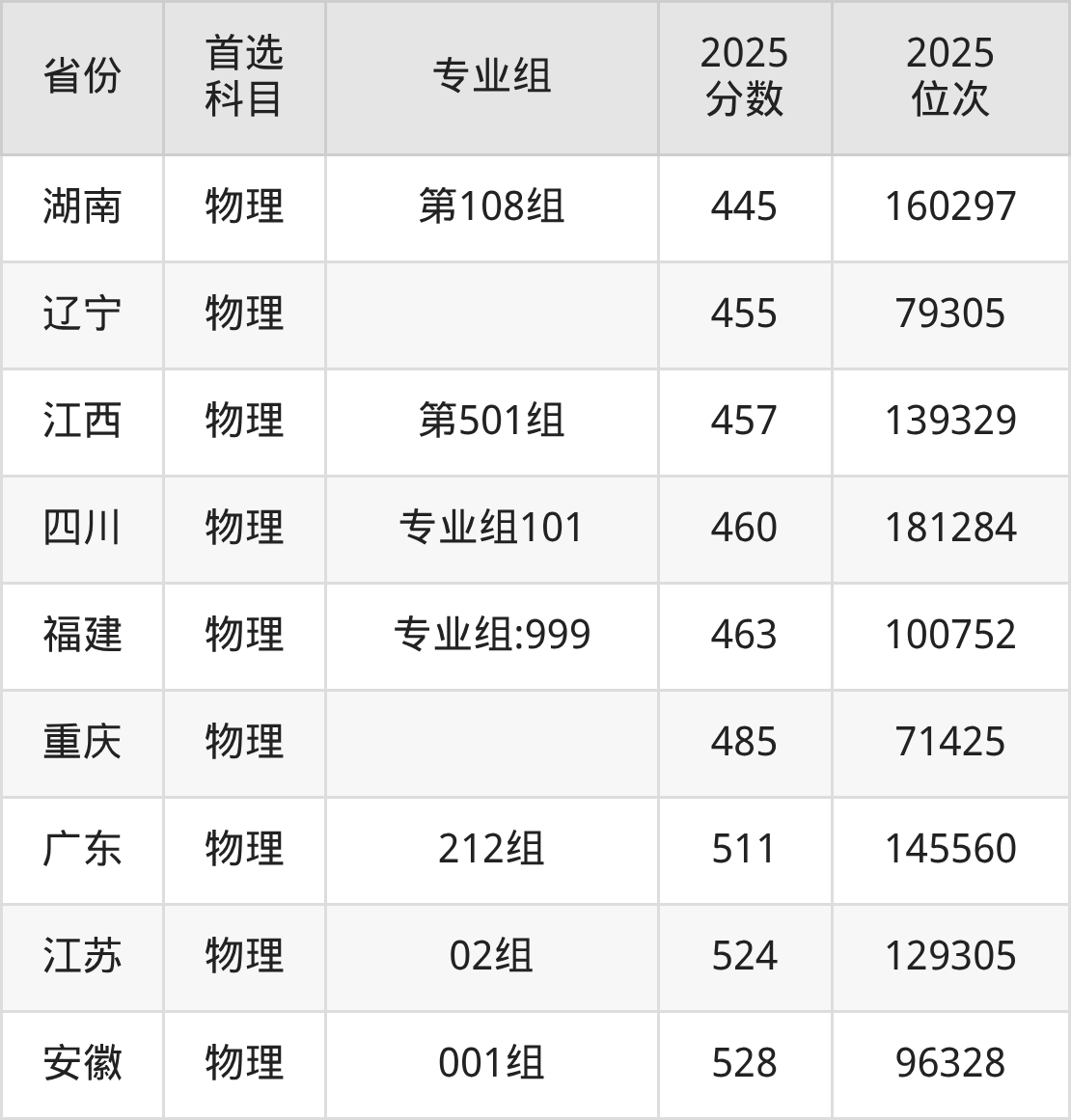 物理类最低分对应地区为黑龙江(第002组),录取位次为72994,超本科线32分;最高分对应地区为安徽(001组),录取位次为96328,超本科线67分。