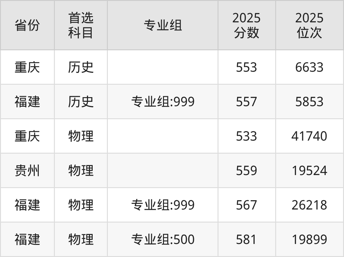 历史类最低分对应地区为重庆,录取位次为6633,超本科线115分;最高分对应地区为福建(专业组:999),录取位次为5853,超本科线107分。