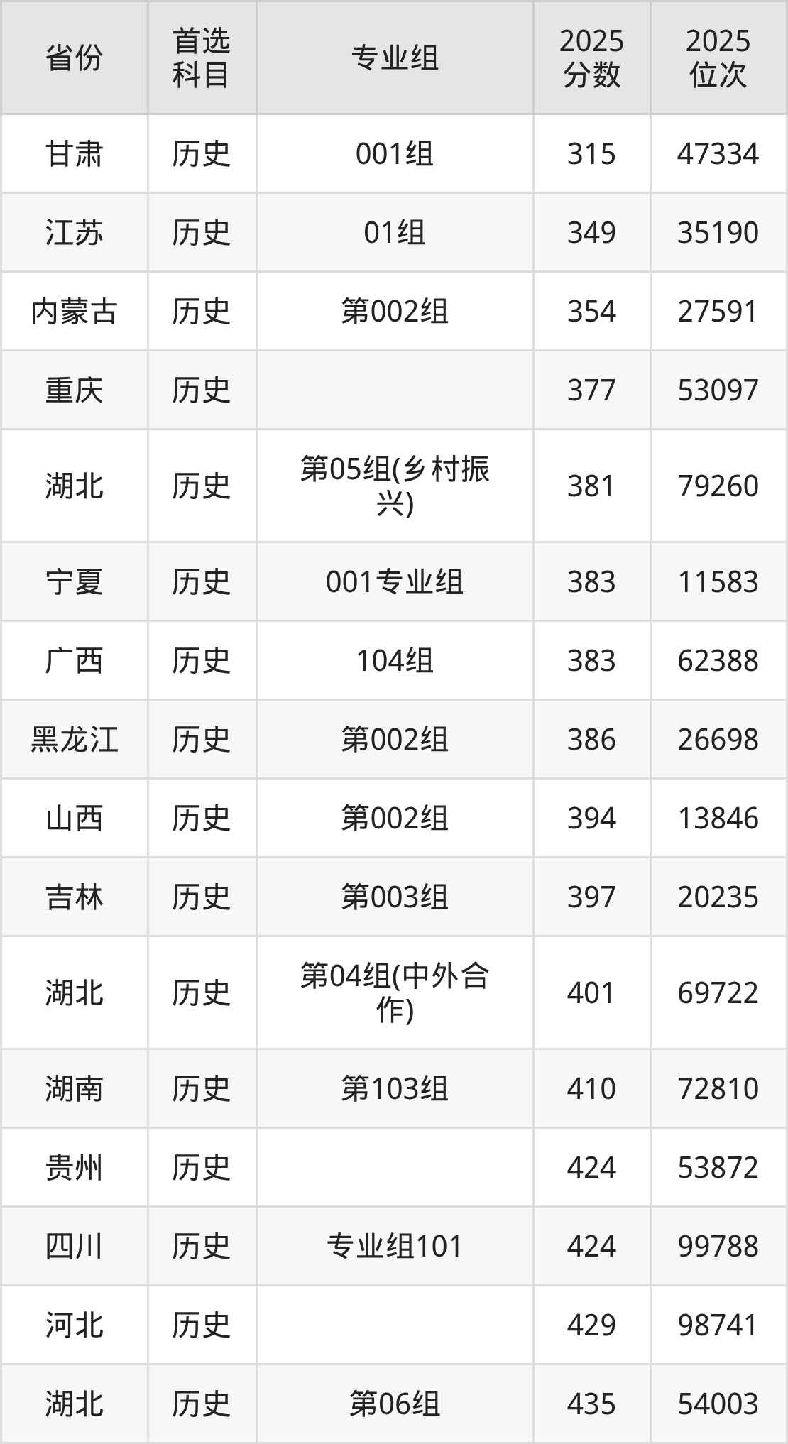 历史类:第05组(乡村振兴)323分、100509名,第06组404分、59047名,第07组379分、71505名,第08组334分、95098名,第09组(高职联办本科)425分、49067名;