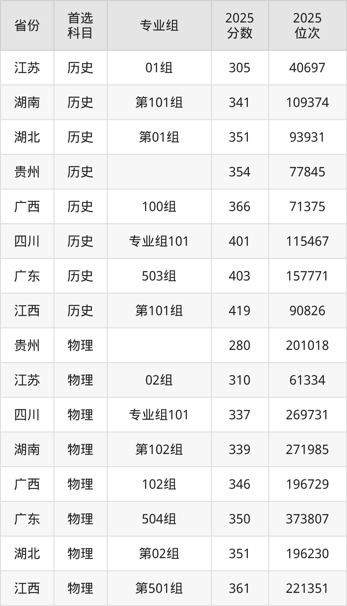 历史类最低分对应地区为江苏(01组),录取位次为40697,超专科线85分;最高分对应地区为江西(第101组),录取位次为90826,超专科线129分。