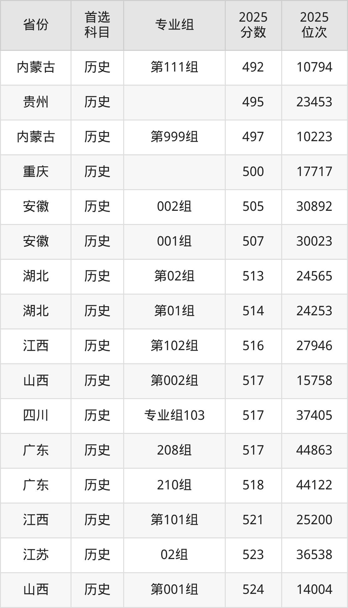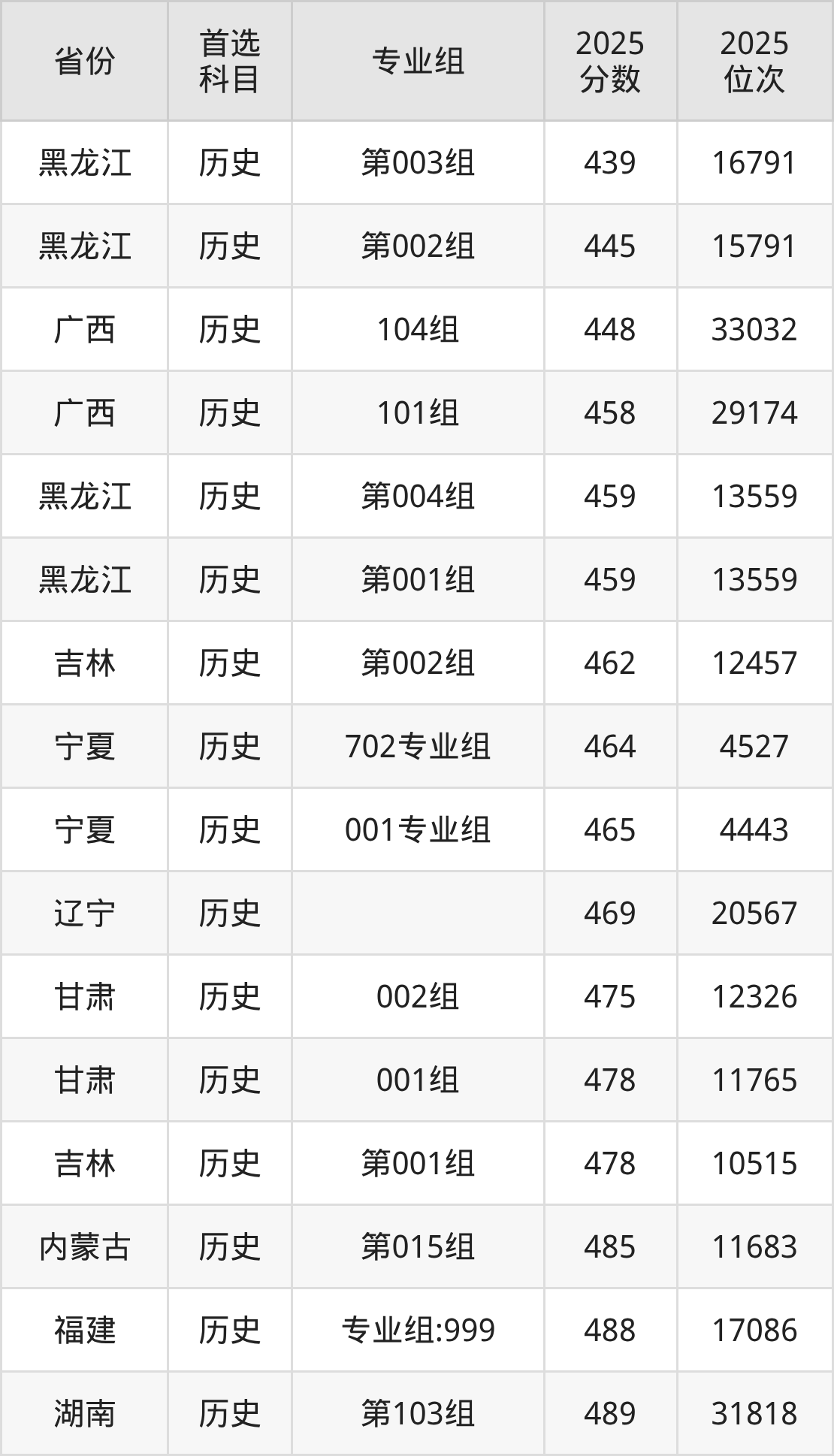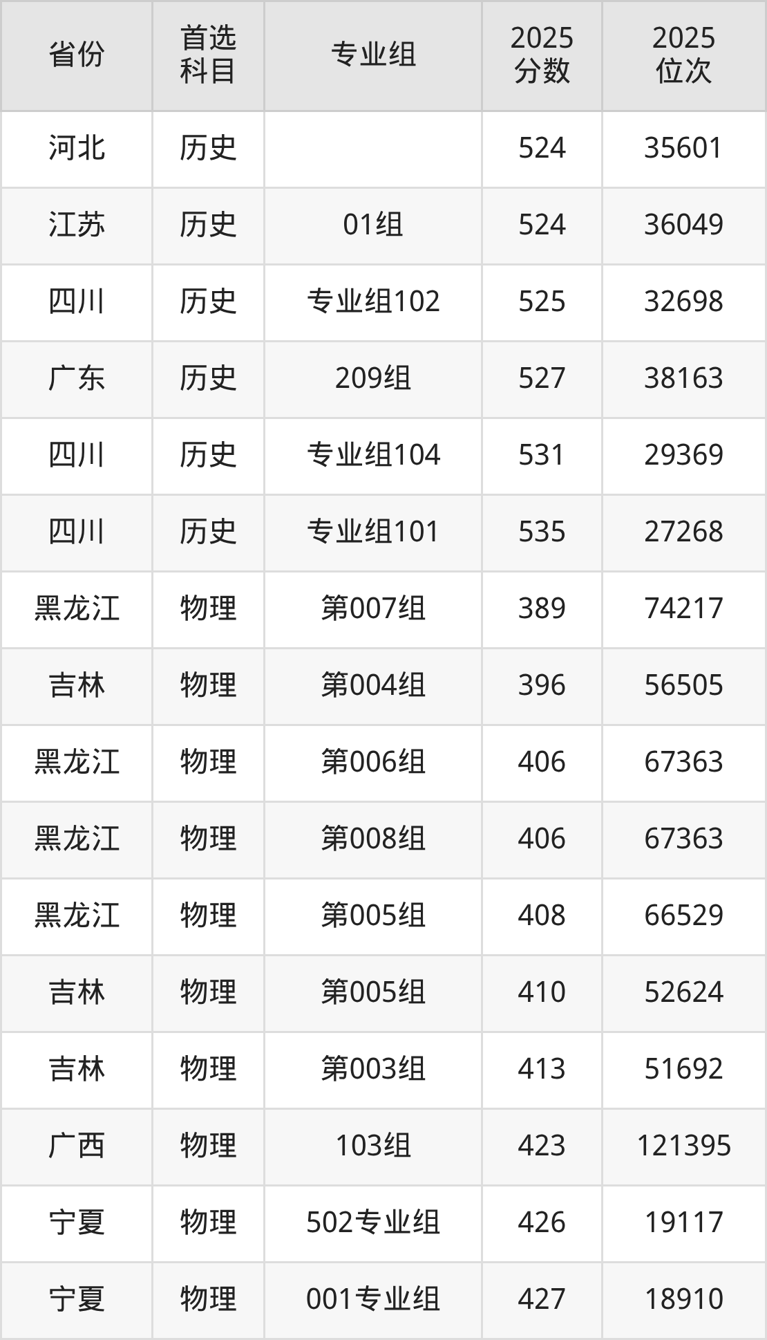 历史类最低分对应地区为黑龙江(第003组),录取位次为16791,超本科线34分;最高分对应地区为四川(专业组101),录取位次为27268,超本科B68分。