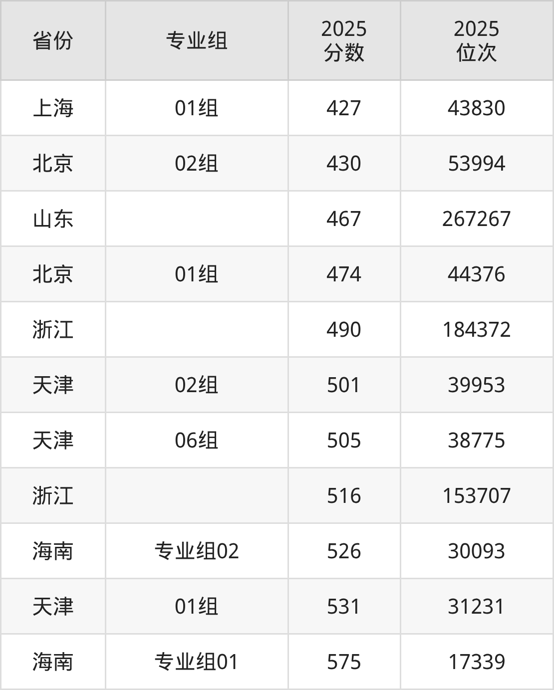 最低分对应地区为上海(01组),录取位次为43830,超本科线25分;最高分对应地区为海南(专业组01),录取位次为17339,超本科线95分。