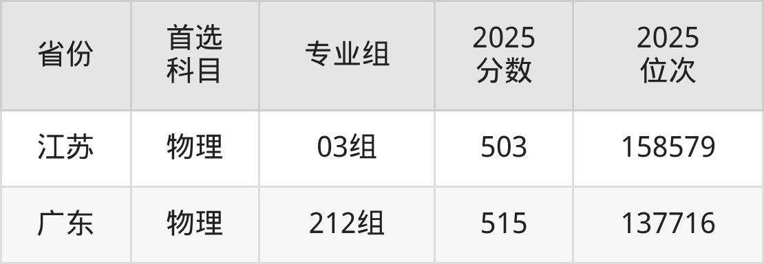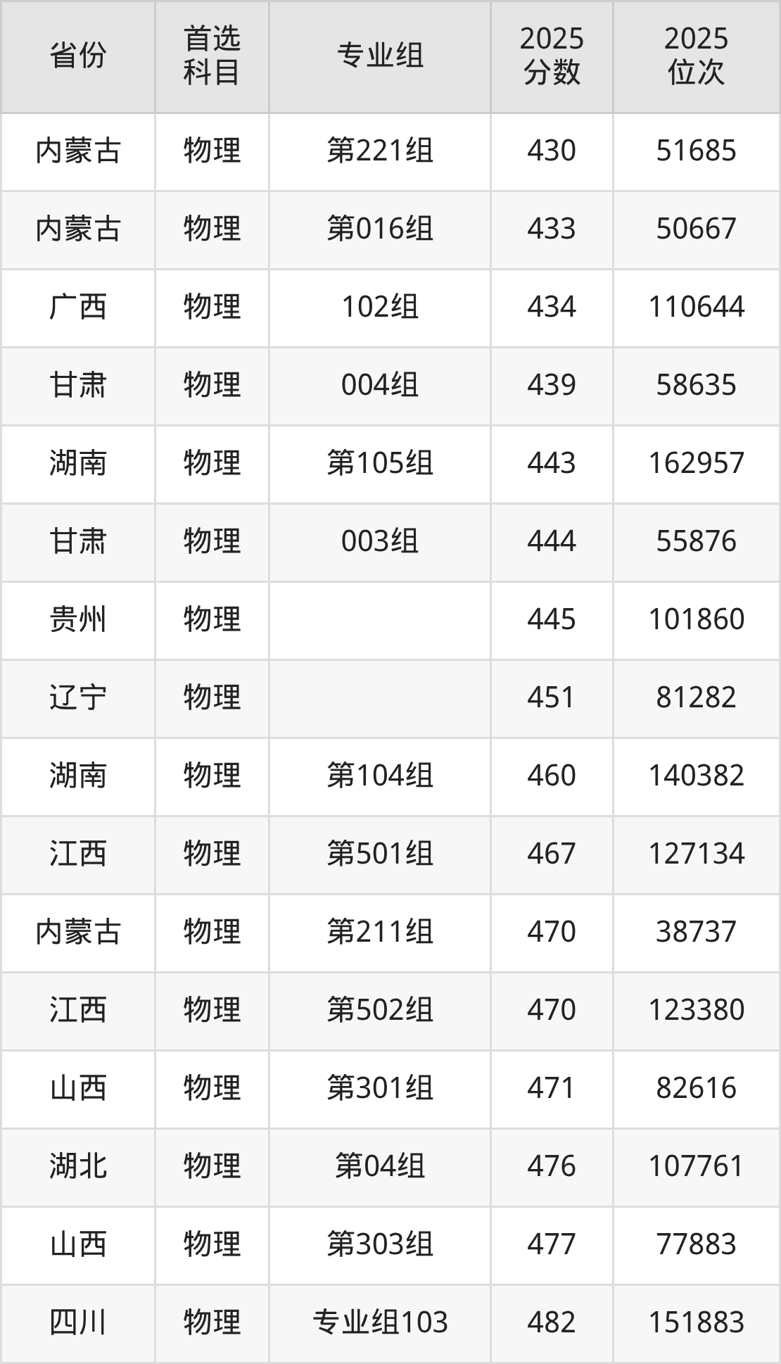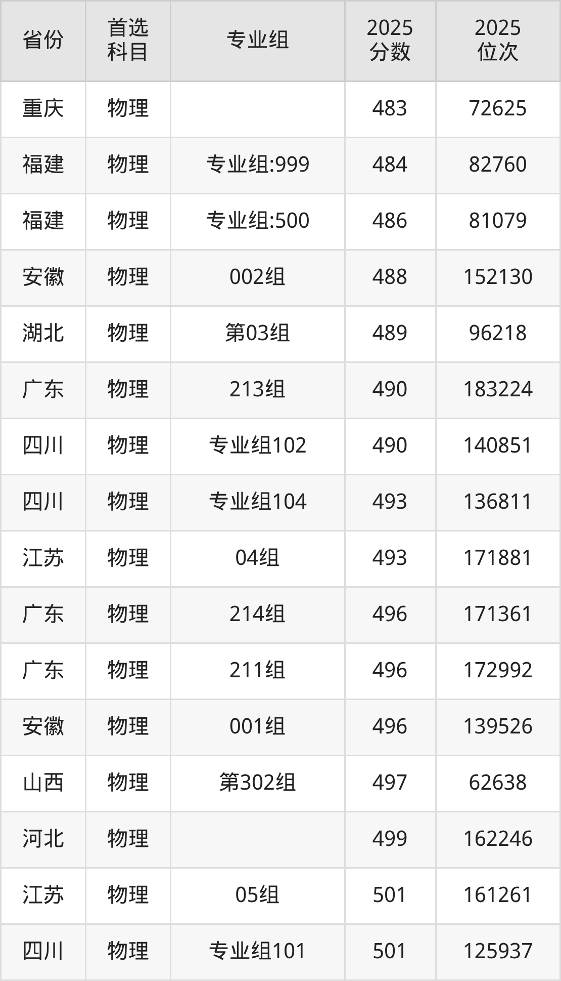 物理类最低分对应地区为黑龙江(第007组),录取位次为74217,超本科线29分;最高分对应地区为广东(212组),录取位次为137716,超本科线79分。