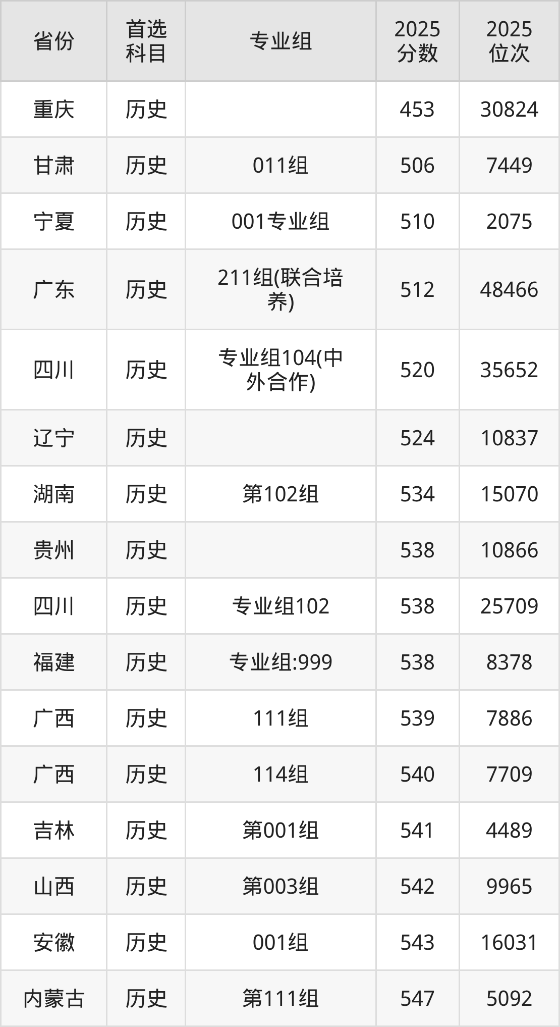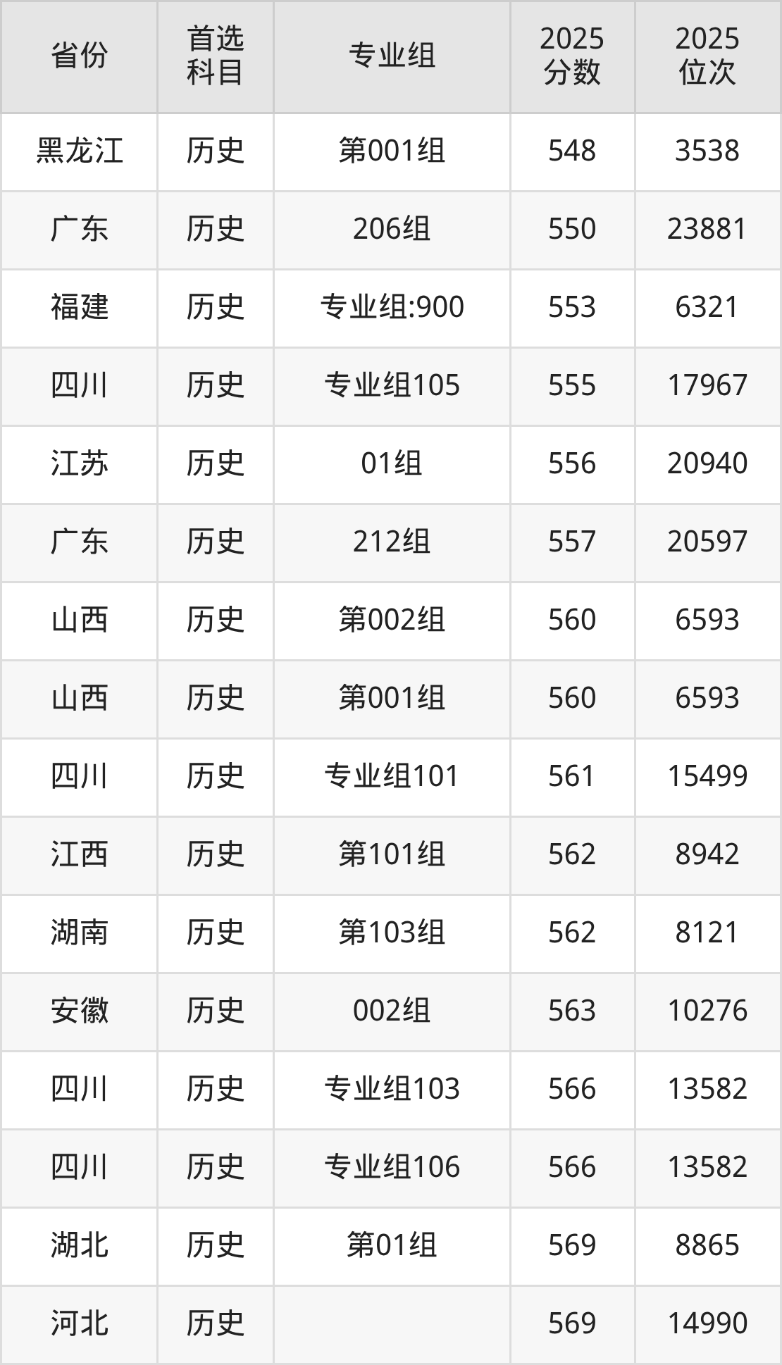 历史类:专业组101561分、15499名,专业组102538分、25709名,专业组103566分、13582名,专业组104(中外合作)520分、35652名,专业组105555分、17967名,专业组106566分、13582名;