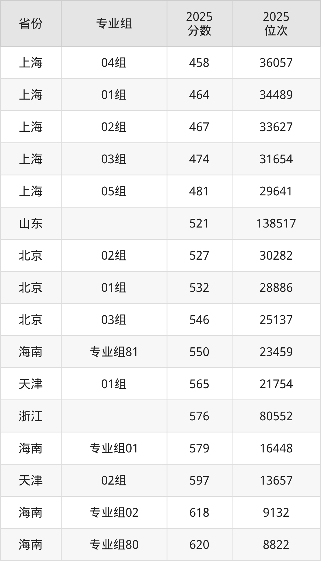最低分对应地区为上海(04组),录取位次为36057,超本科线56分;最高分对应地区为海南(专业组80),录取位次为8822。