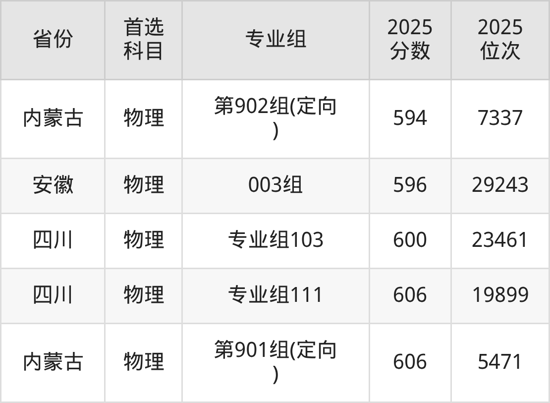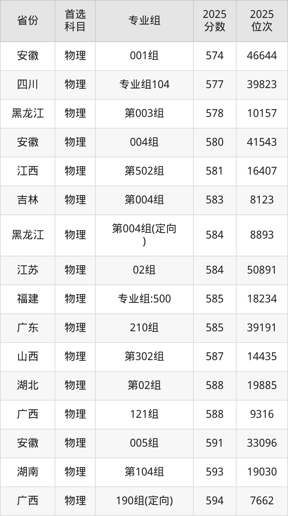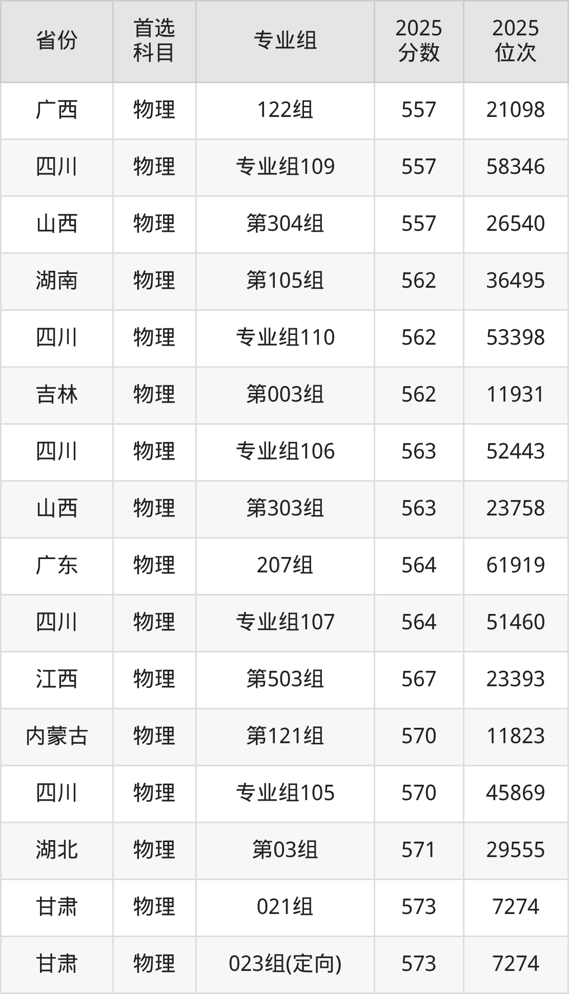 物理类:专业组101541分、75327名,专业组102(中外合作)468分、170913名,专业组103600分、23461名,专业组104577分、39823名,专业组105570分、45869名,专业组106563分、52443名,专业组107564分、51460名,专业组108540分、76490名,专业组109557分、58346名,专业组110562分、53398名,专业组111606分、19899名;