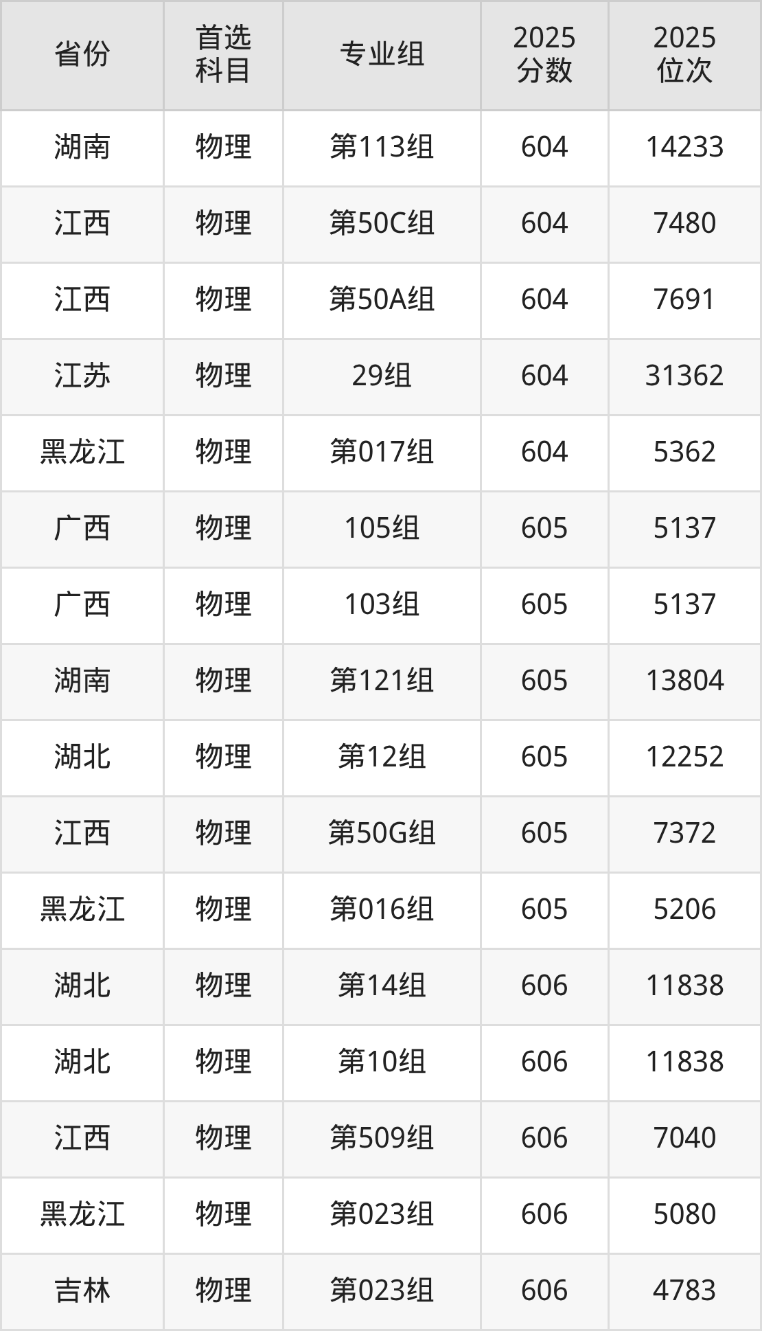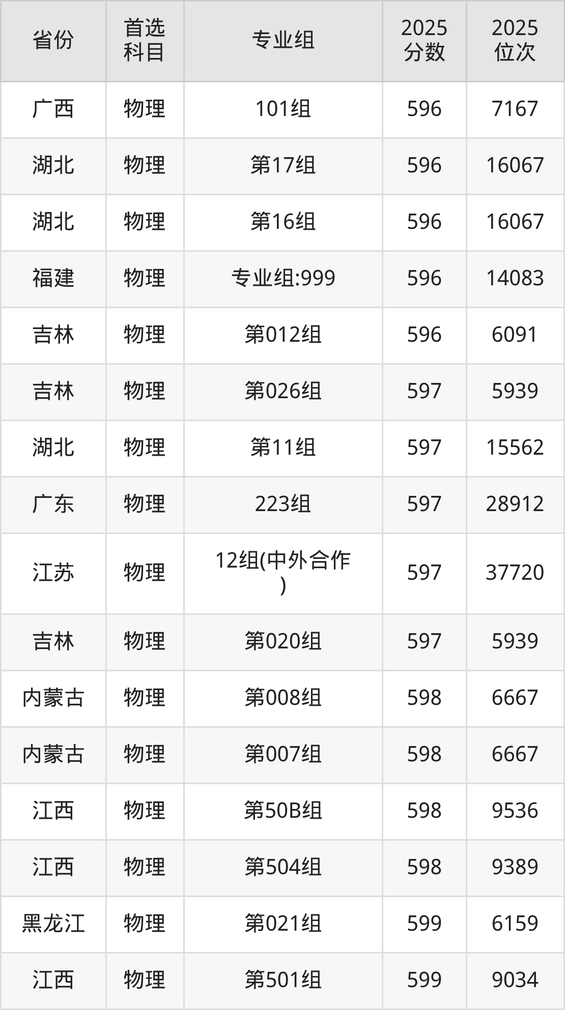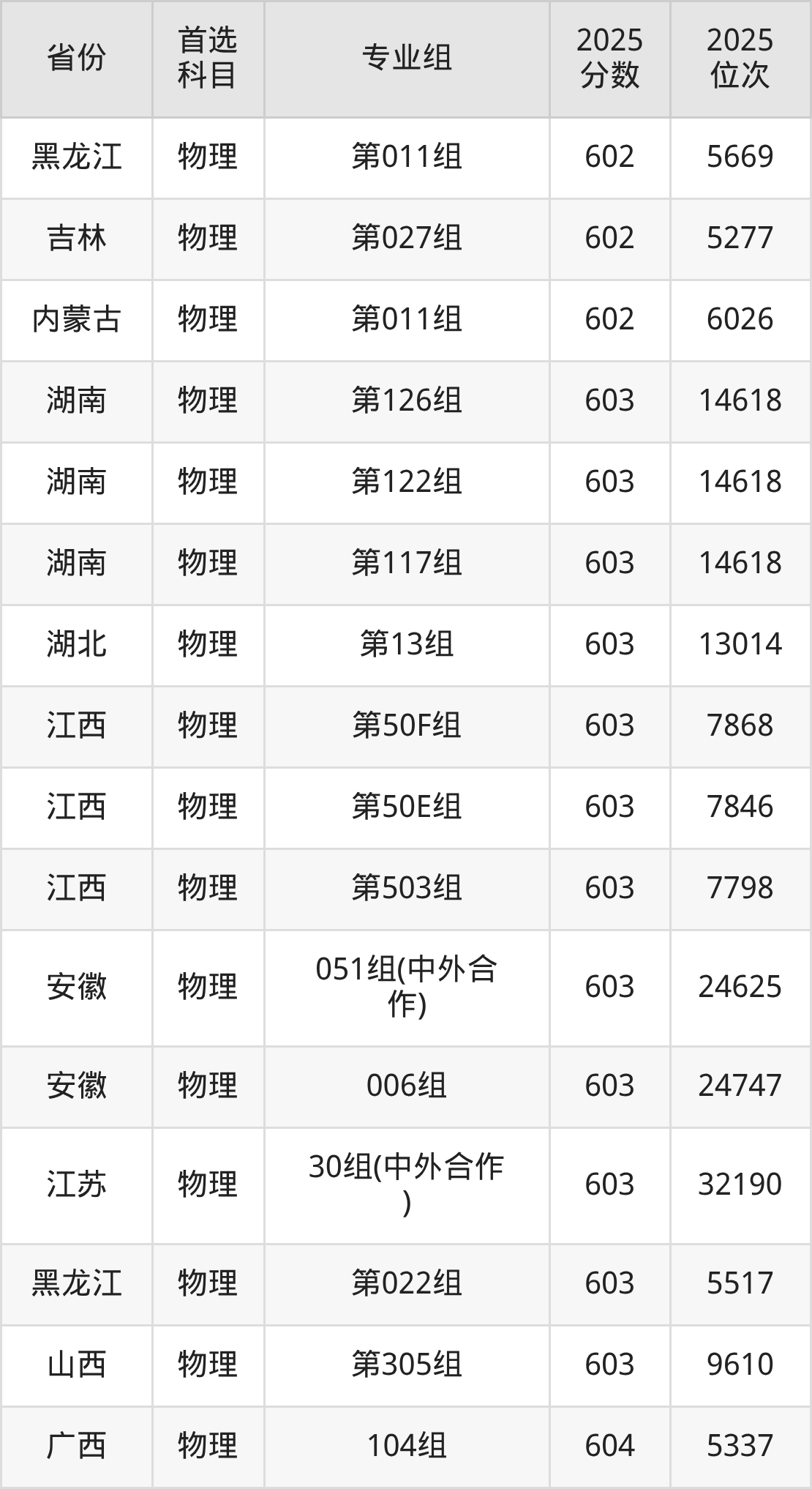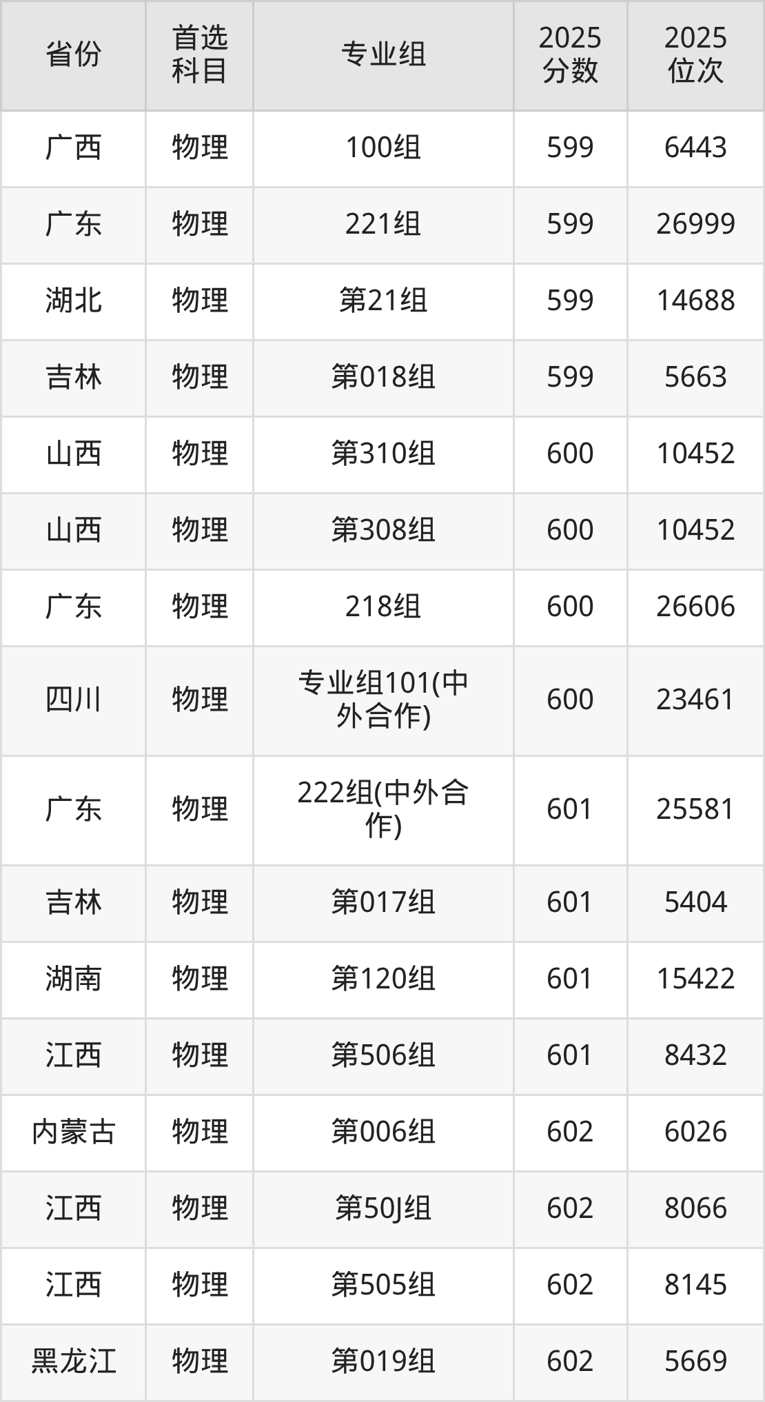 物理类:04组602分、30377名,05组(中外合作)587分、42009名,06组604分、28962名,07组(中外合作)595分、35651名,08组625分、15652名,09组601分、31135名。