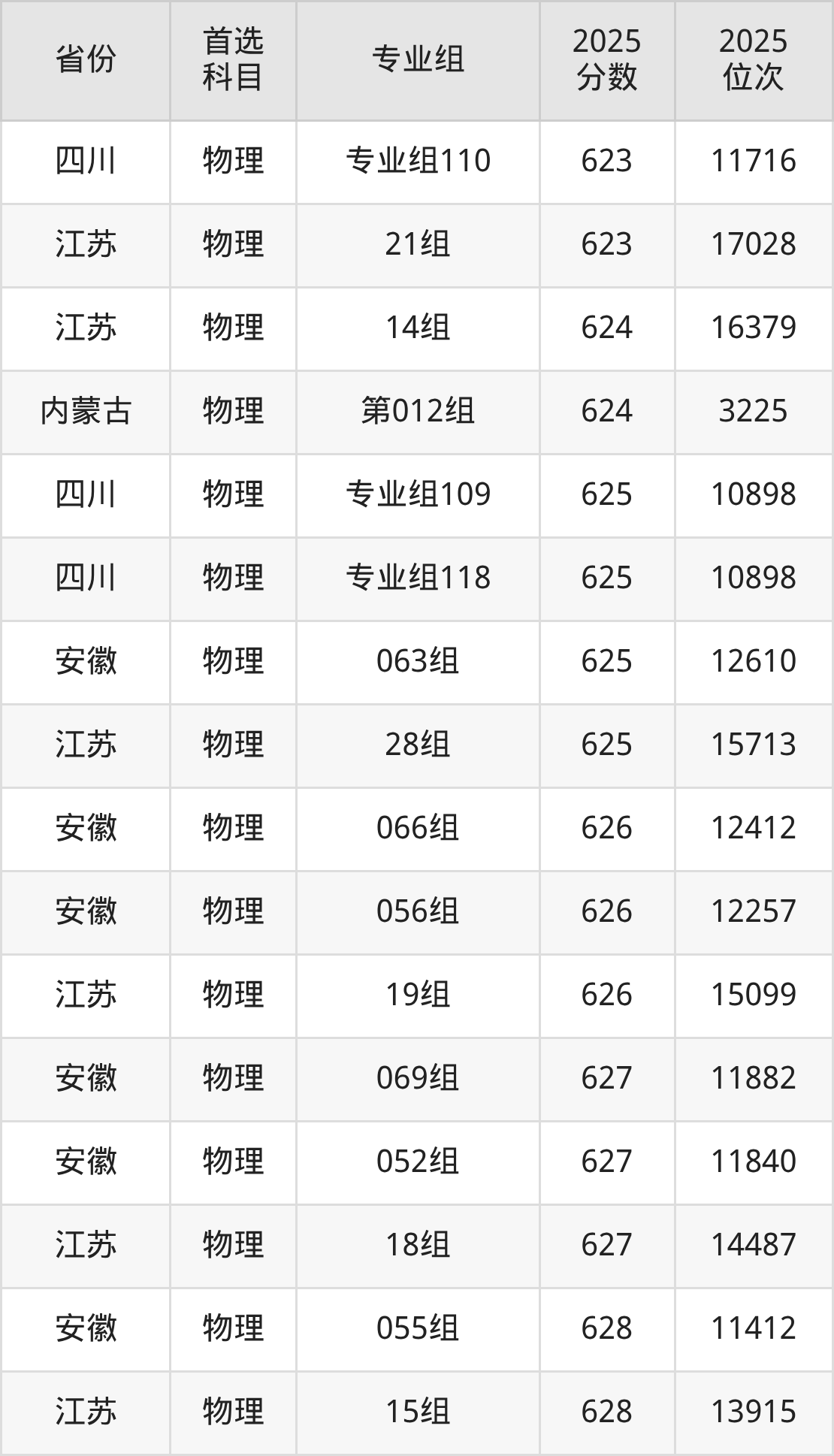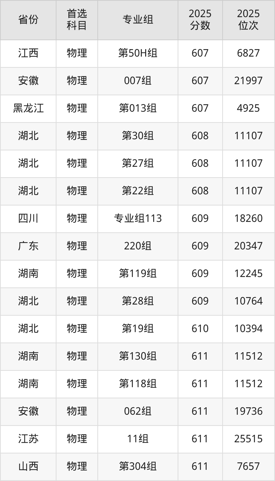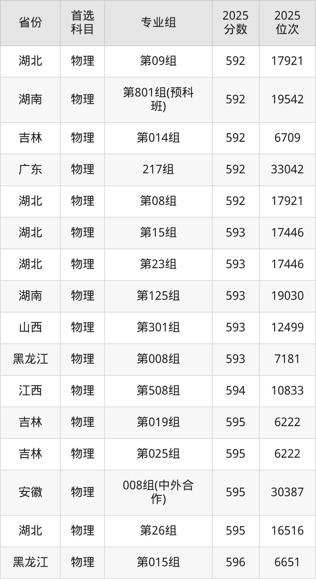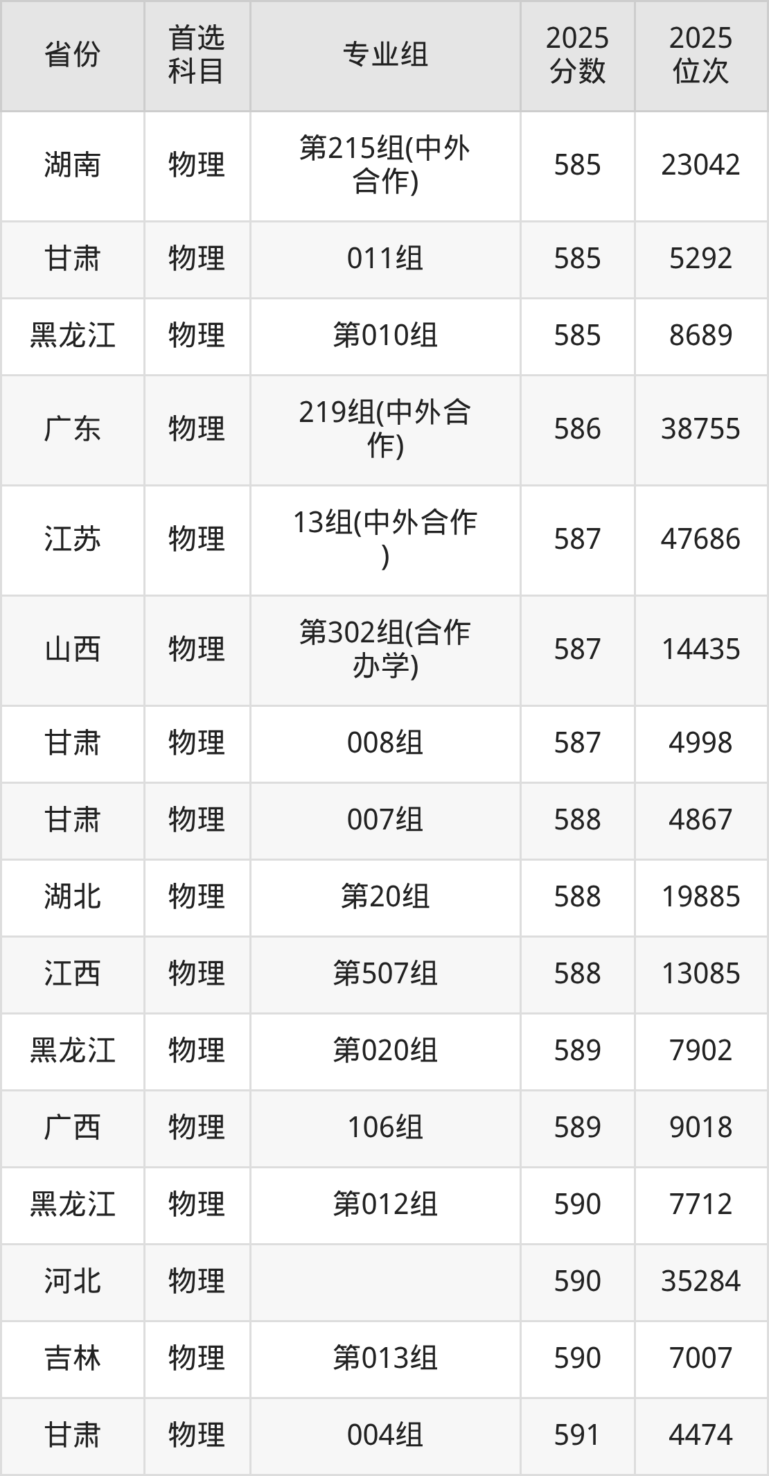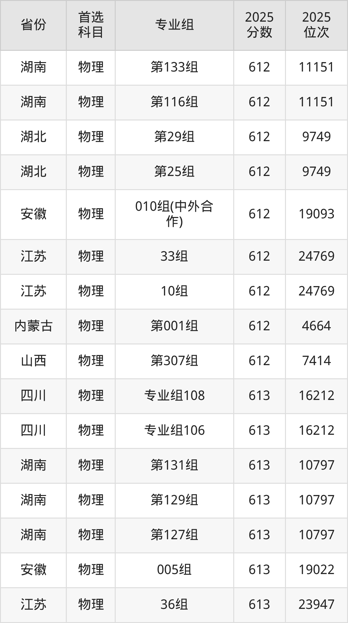 物理类:04组602分、30377名,05组(中外合作)587分、42009名,06组604分、28962名,07组(中外合作)595分、35651名,08组625分、15652名,09组601分、31135名。