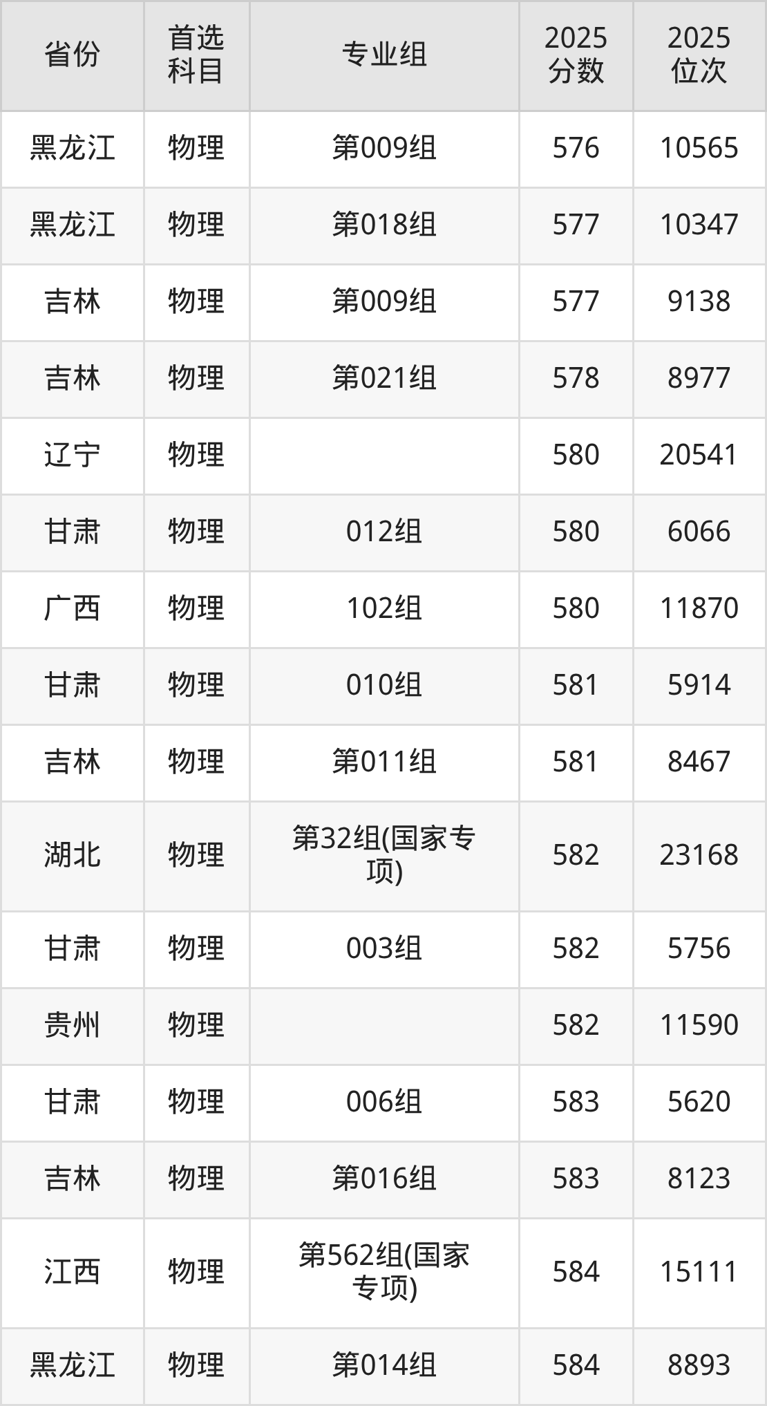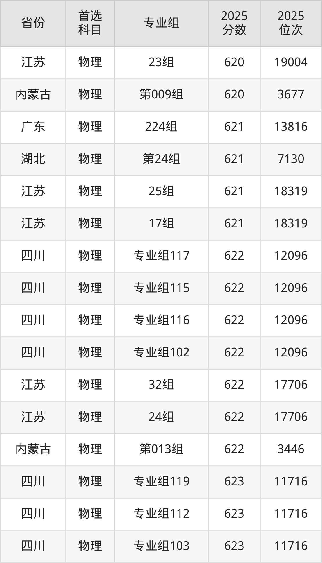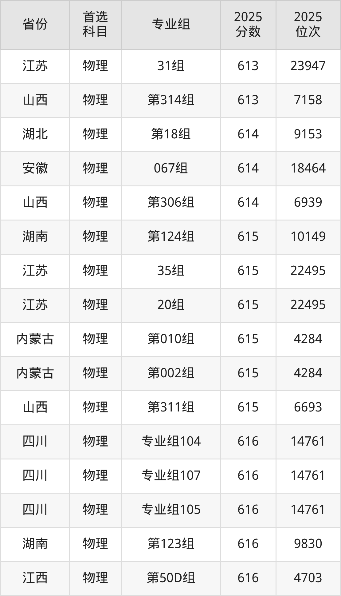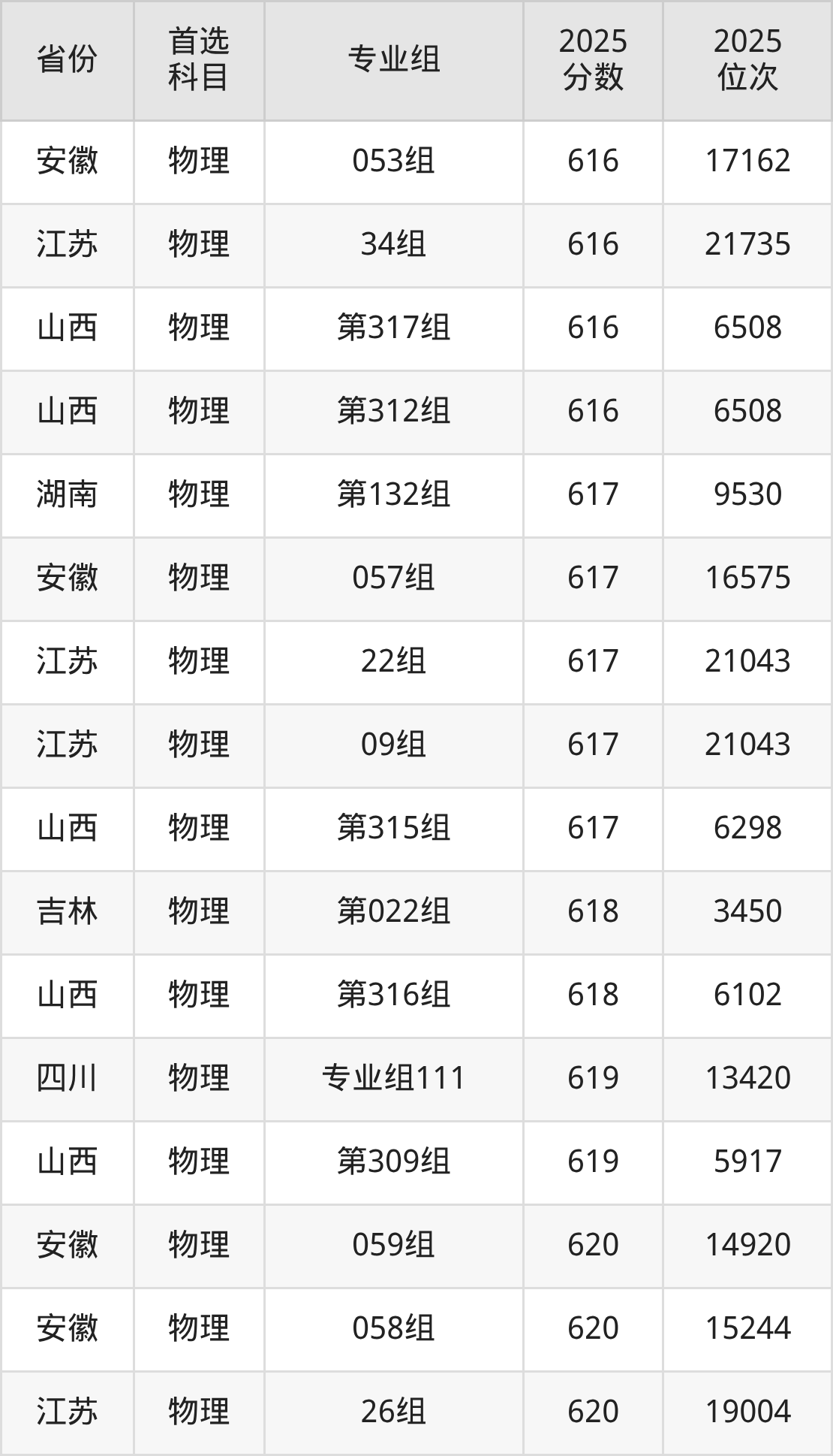 物理类:09组617分、21043名,10组612分、24769名,11组611分、25515名,12组(中外合作)597分、37720名,13组(中外合作)587分、47686名,14组624分、16379名,15组628分、13915名,16组637分、9279名,17组621分、18319名,18组627分、14487名,19组626分、15099名,20组615分、22495名,21组623分、17028名,22组617分、21043名,23组620分、19004名,24组622分、17706名,25组621分、18319名,26组620分、19004名,27组641分、7529名,28组625分、15713名,29组604分、31362名,30组(中外合作)603分、32190名,31组613分、23947名,32组622分、17706名,33组612分、24769名,34组616分、21735名,35组615分、22495名,36组613分、23947名;