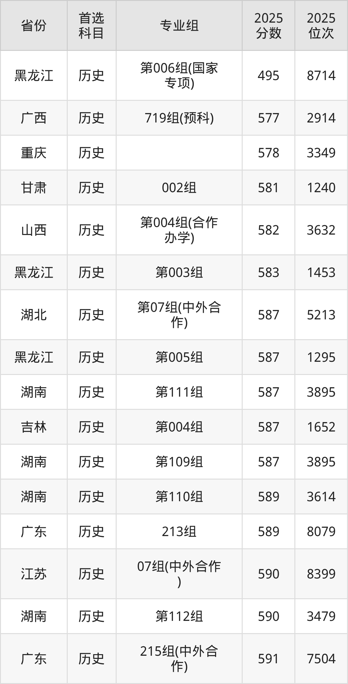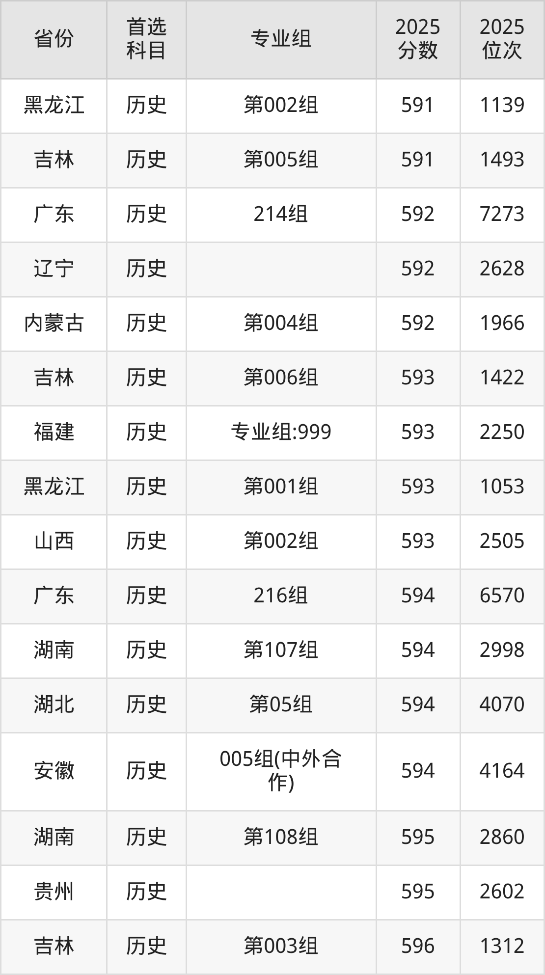 历史类:01组594分、5199名,02组(中外合作)582分、7784名,03组598分、4403名;
