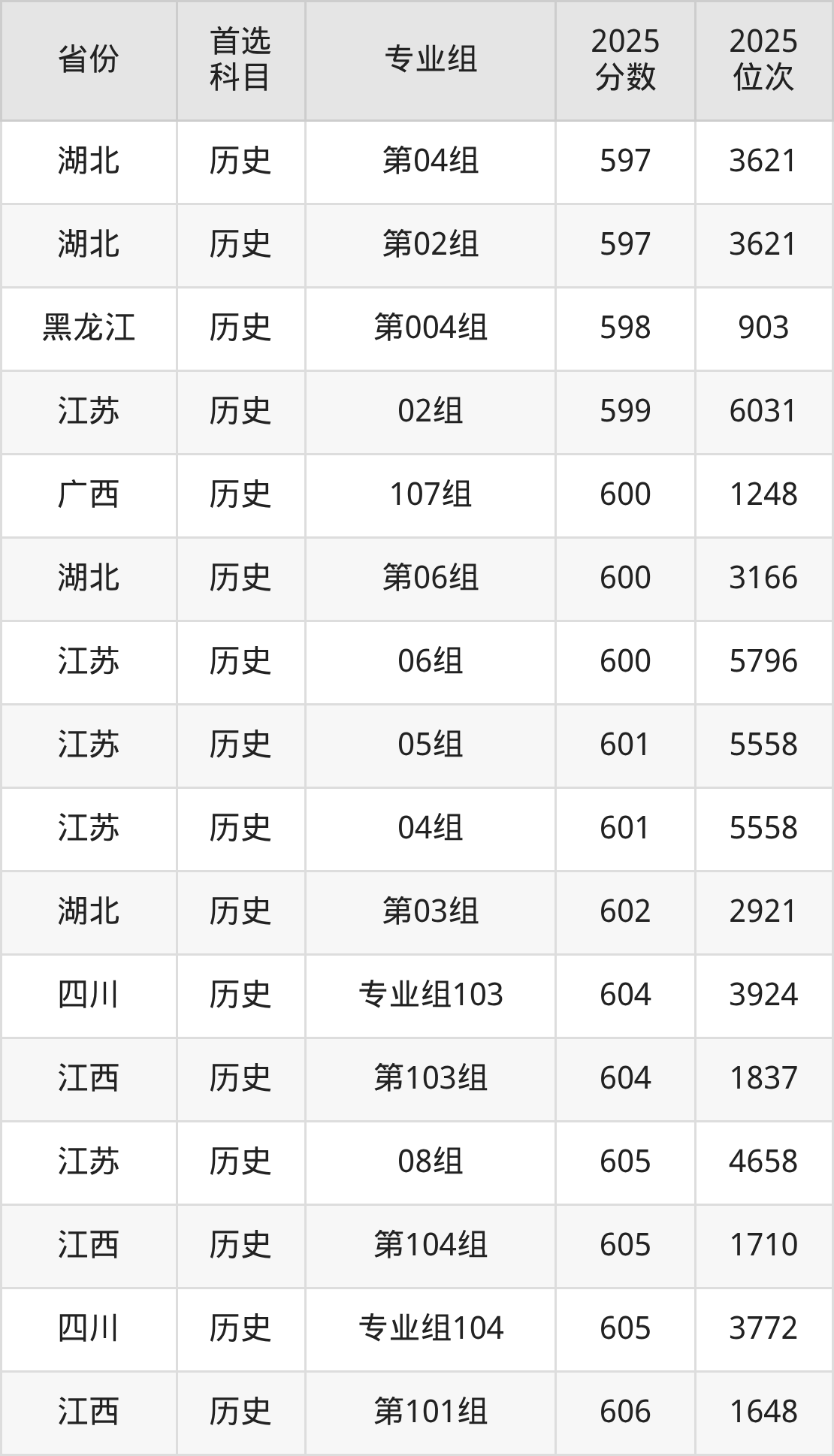 历史类:01组611分、3605名,02组599分、6031名,03组606分、4462名,04组601分、5558名,05组601分、5558名,06组600分、5796名,07组(中外合作)590分、8399名,08组605分、4658名;