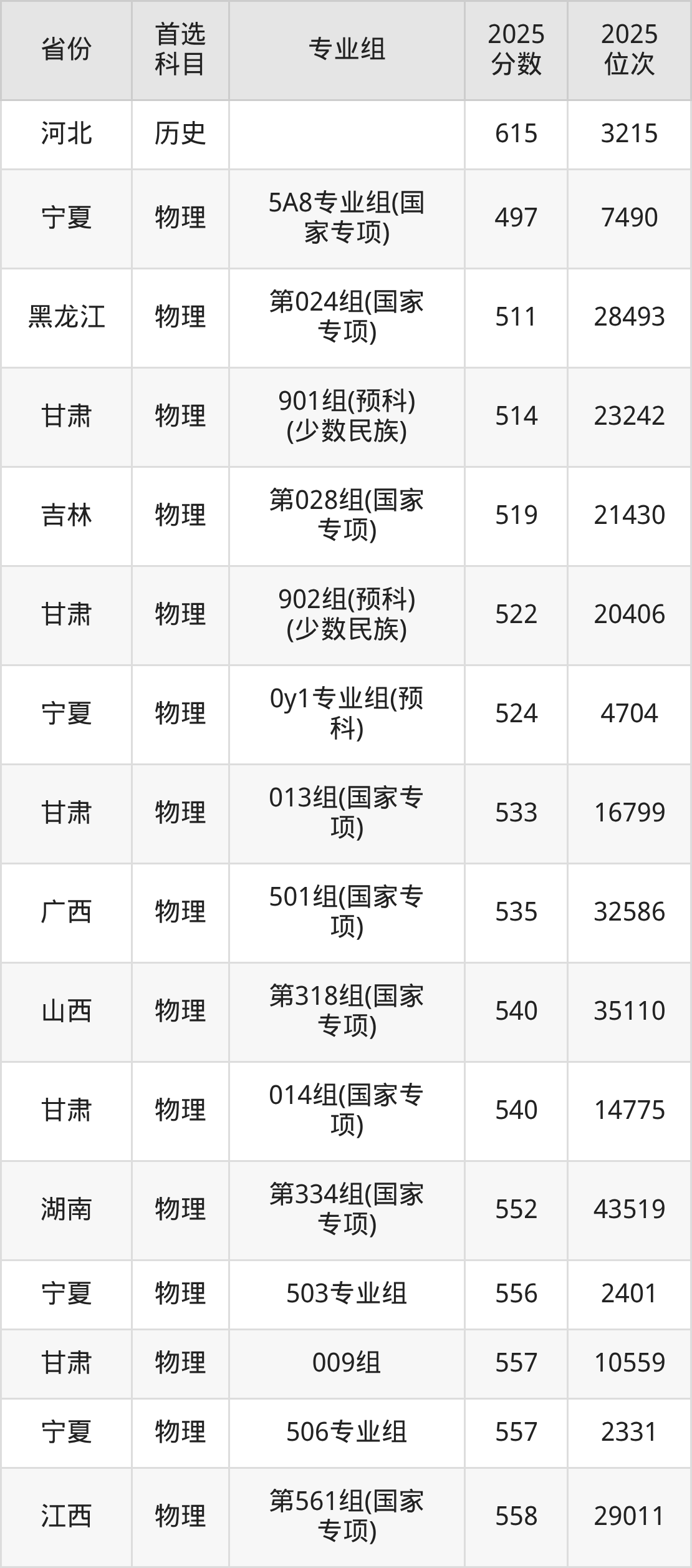 历史类最低分对应地区为黑龙江(第006组(国家专项)),录取位次为8714;最高分对应地区为河北,录取位次为3215,超本科线138分。
