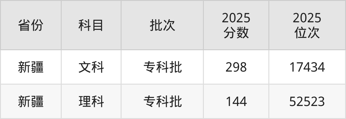 理科最低分对应地区为新疆,录取位次为52523,超专科线4分。