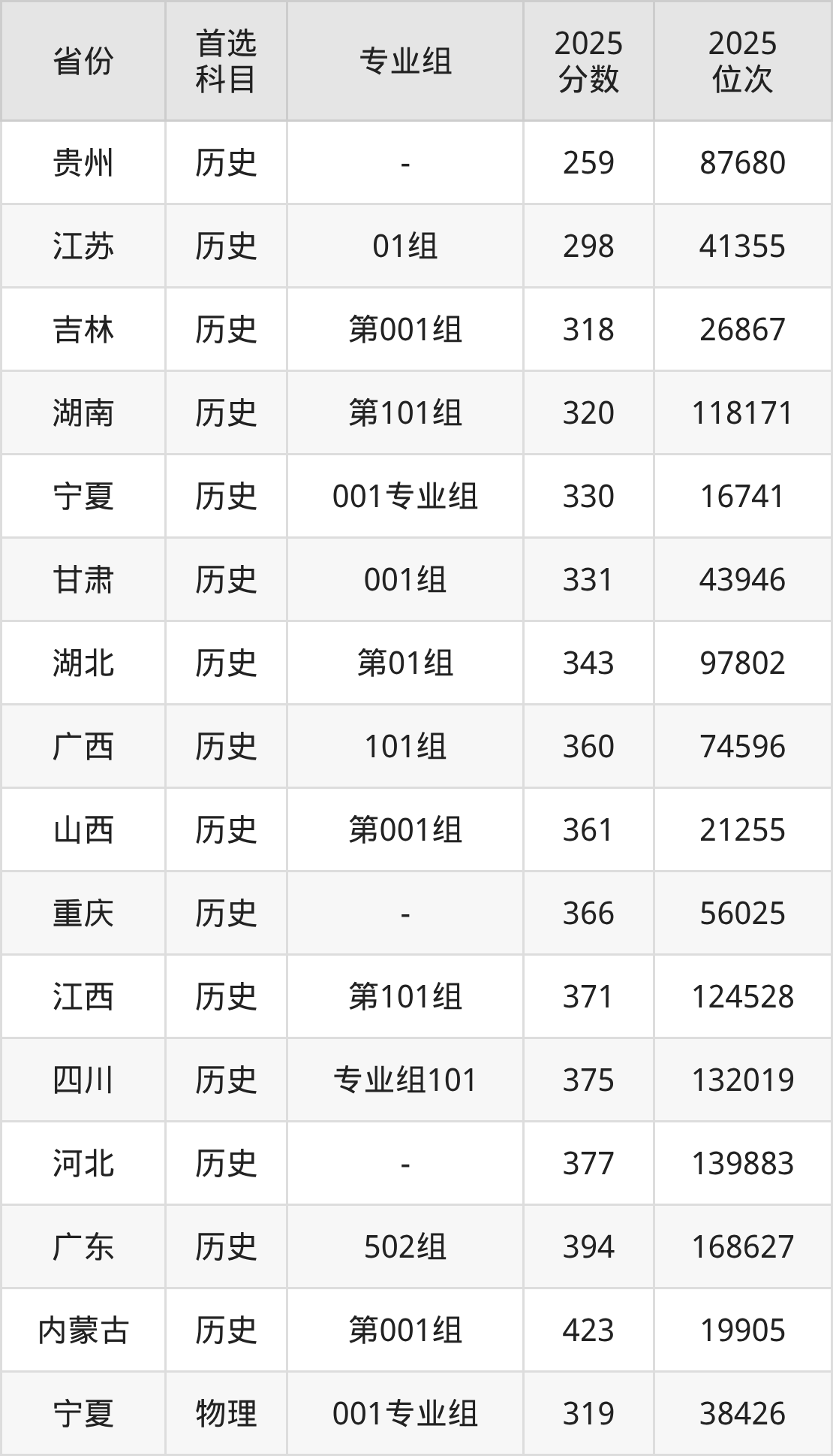 历史类最低分对应地区为贵州,录取位次为87680,超专科线79分;最高分对应地区为内蒙古(第001组),录取位次为19905,超专科线263分。