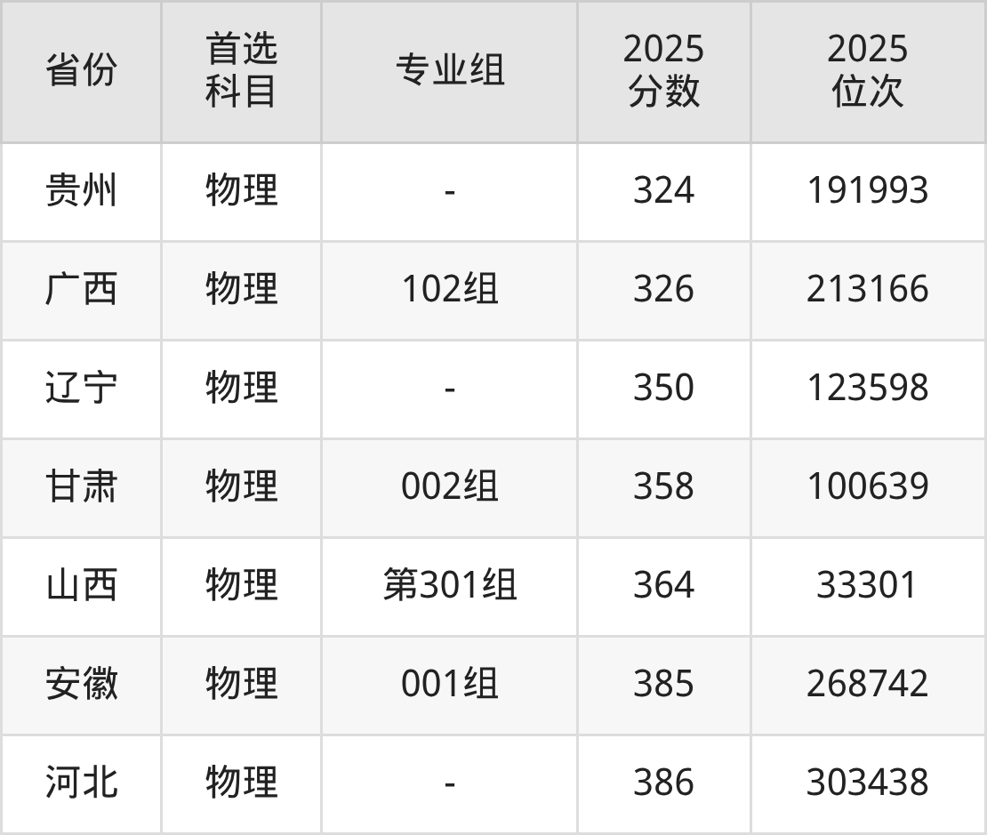 物理类最低分对应地区为宁夏(001专业组),录取位次为38426,超专科线169分;最高分对应地区为河北,录取位次为303438,超专科线186分。