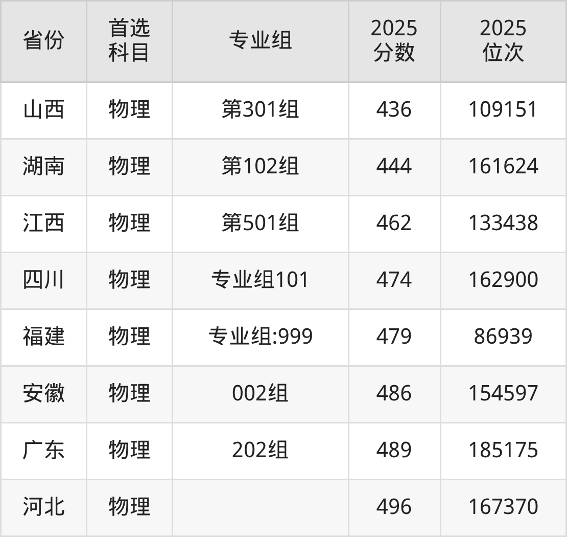 物理类最低分对应地区为重庆,录取位次为131452,超专科线146分;最高分对应地区为河北,录取位次为167370,超本科线37分。