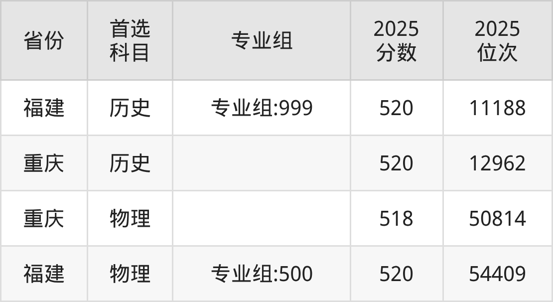 历史类最低分对应地区为福建(专业组:999),录取位次为11188;最高分对应地区为重庆,录取位次为12962,超本科线82分。