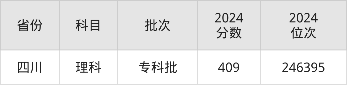 理科最低分对应地区为四川,录取位次为246395,超专科线259分。